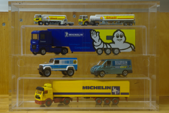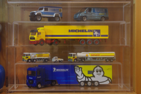 また談話コーナーの棚に設置しましたディスプレイケースからMajorette Eligor Ho 1/87 Camion Remorque Centrale Renault Magnum 440 Cv Michelinを個別移動しましたために、空きました最下段スペースにはまずFahrzeugmode Mercedes 1626 Sattelzug "Michelin"を移動しました。