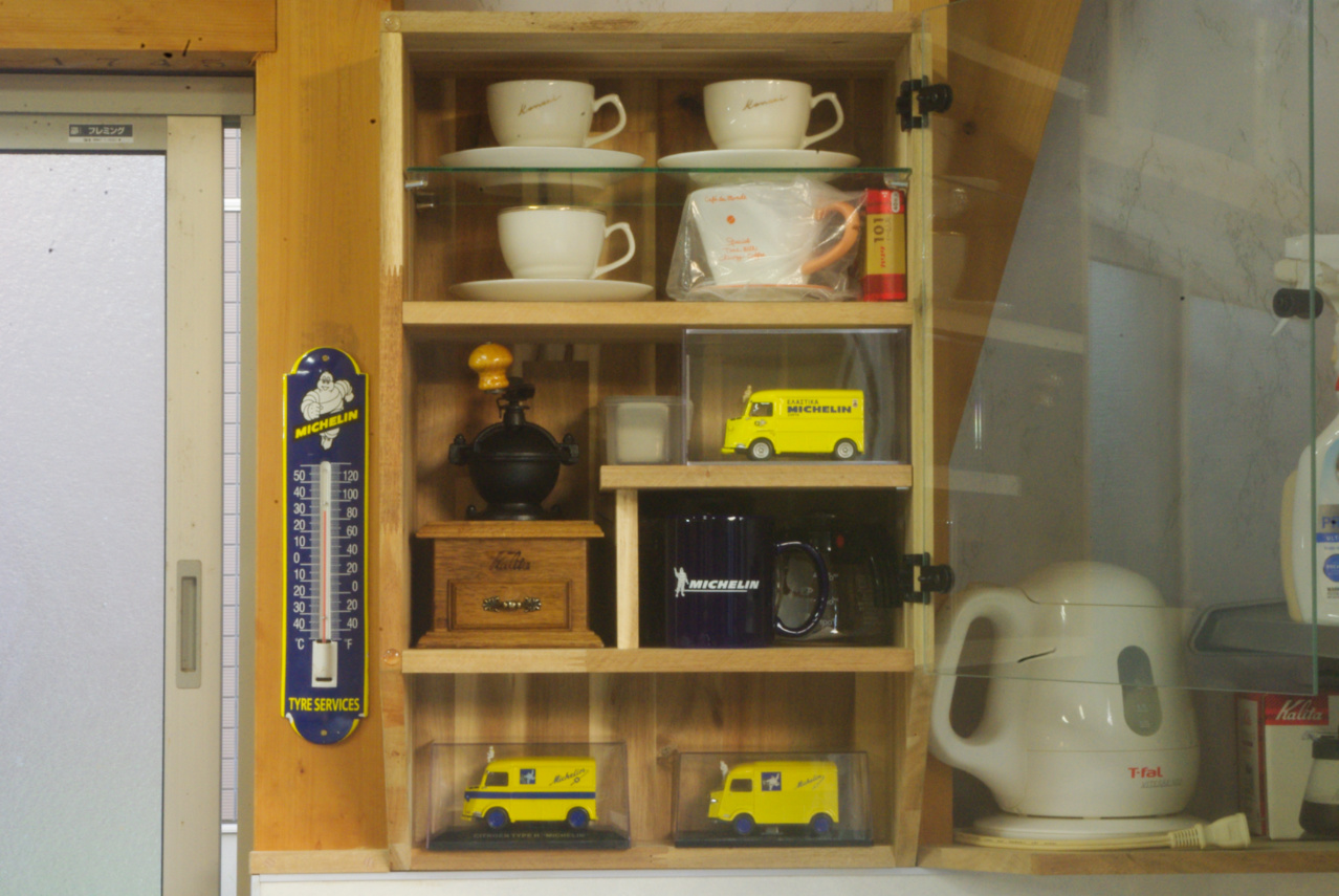 また食器棚と同じ材質のアカシヤ集成材の板を使用することにより、ちょっとしたカスタム感も表現出来たのではないかと思います。