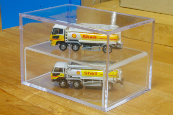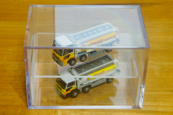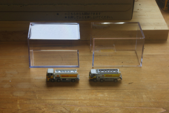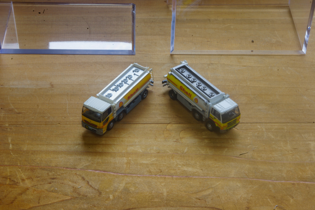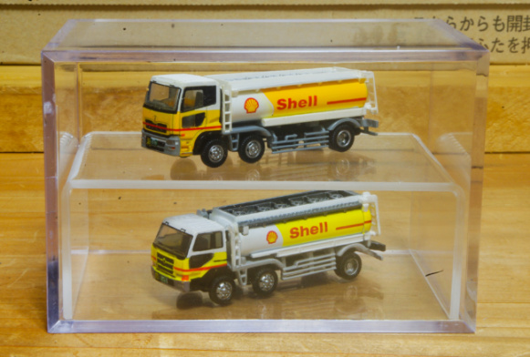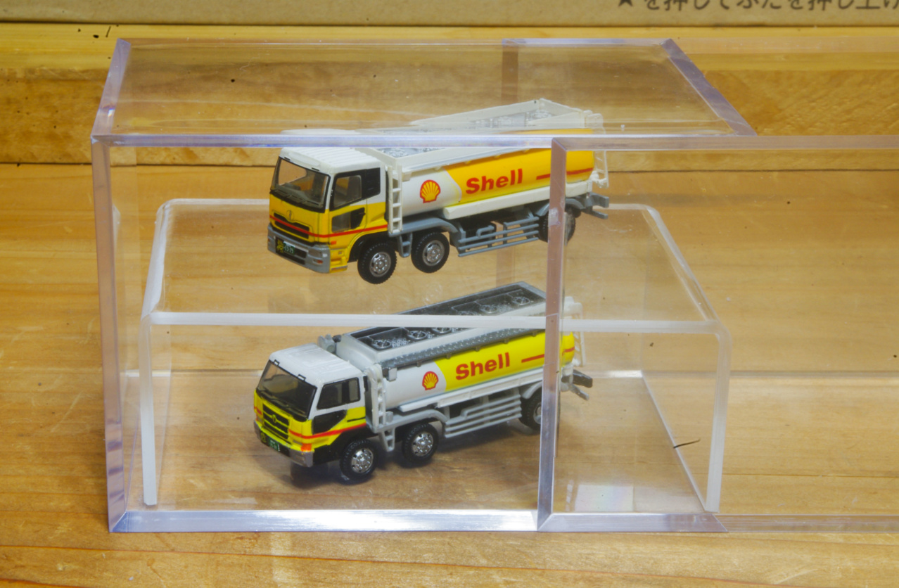 新旧日産ディーゼル 昭和シェル石油タンクローリーを上下2段にしますミノルキューブロングに収納します。