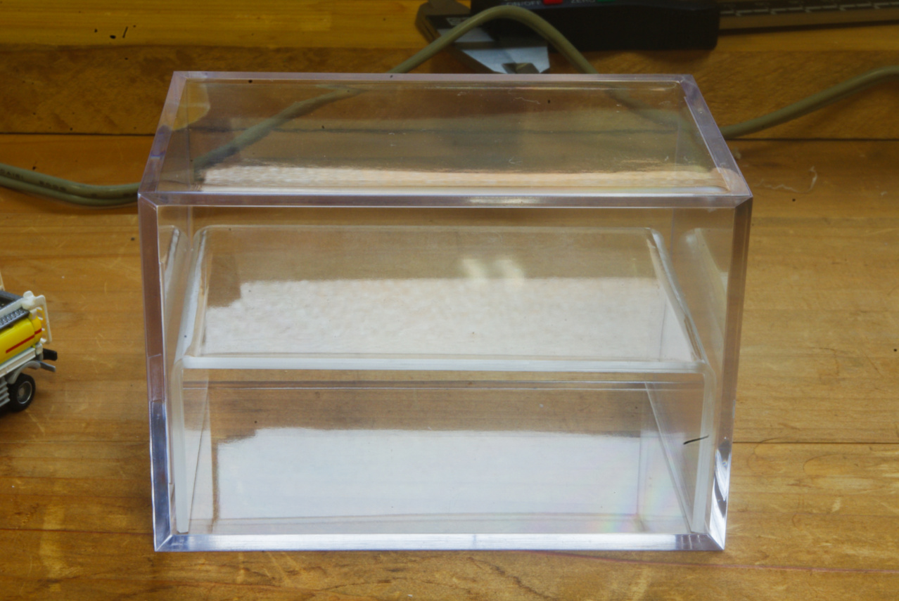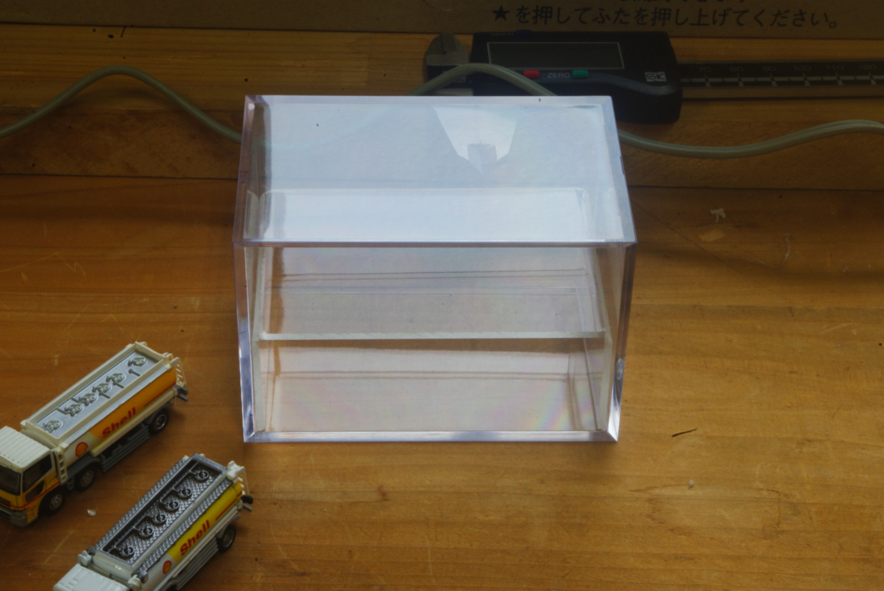 これはAmazonでこの度の展示用ケースを探していました際に、フィギュアのディスプレイ用に様々な大きさのこれに似た既製品が販売されていましたので、その程度のものなら自作したほうが遥かに安上がりですし、サイズも自由に製作出来るためこの方法を思いついたまでです。