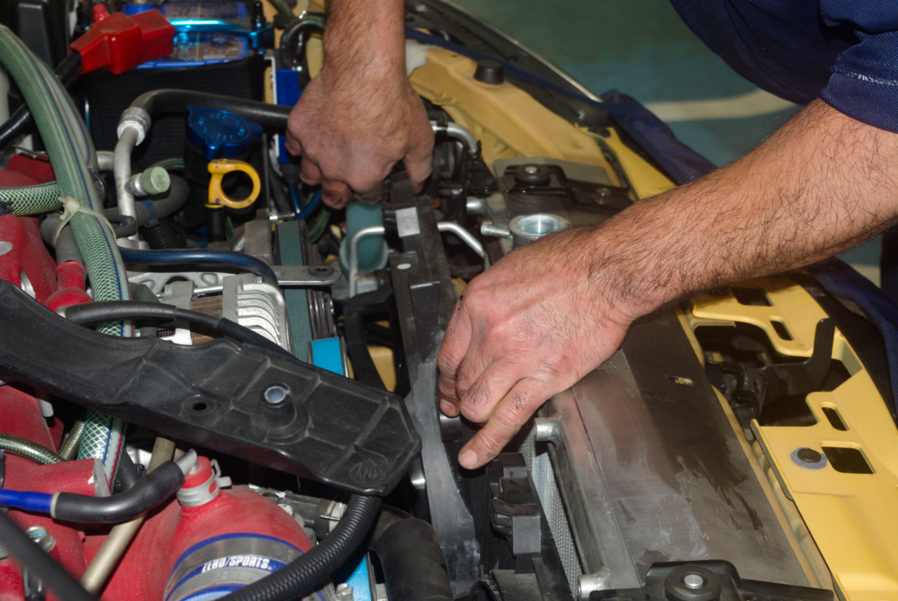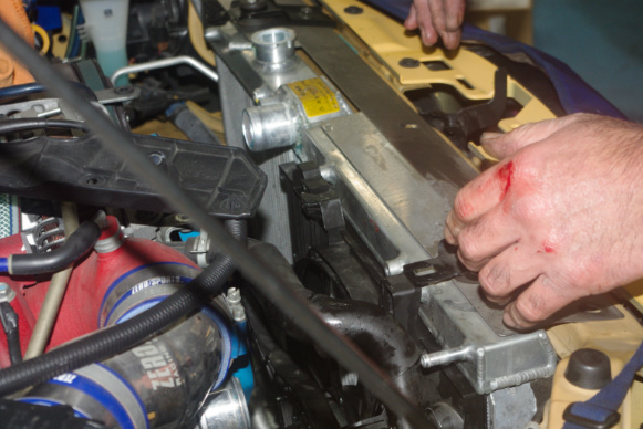 愛車のラジエターコアは2層で純正ラジエターよりも1㎝以上の厚みがありますので、このような作業を行うにはスペースに充分な余裕がありません。