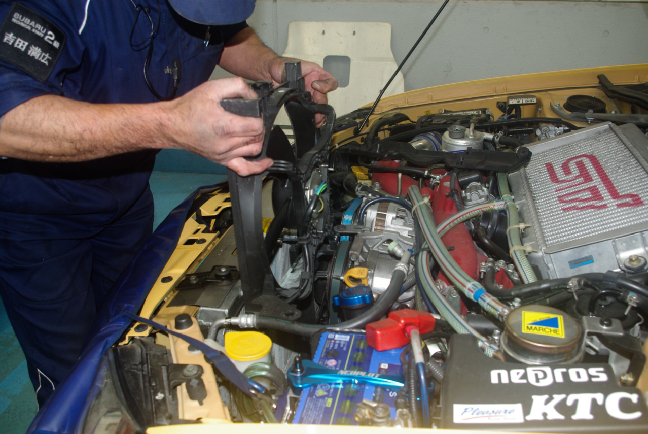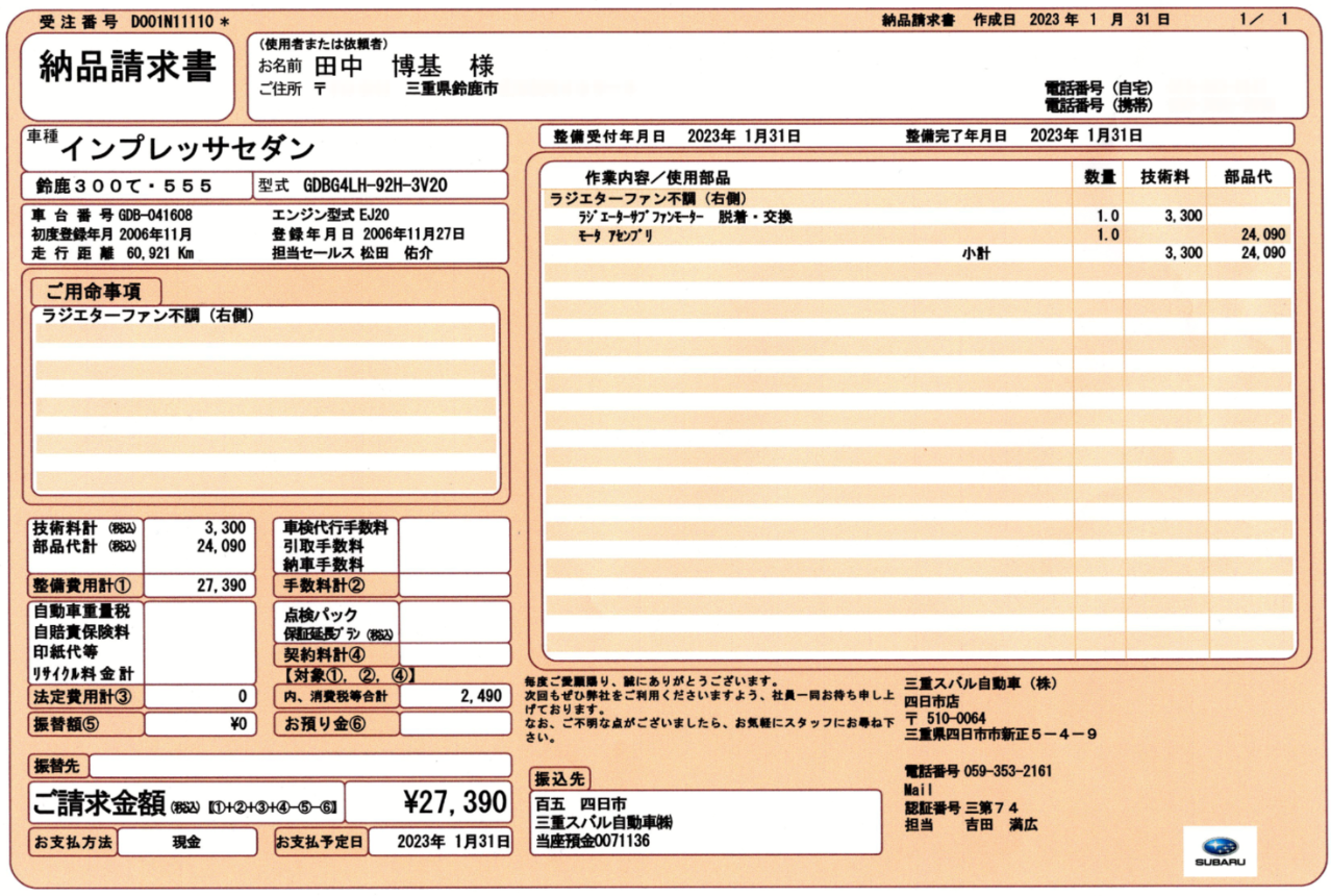 本日は1月23日に実施しましたサーモスタット交換時に発覚しました右冷却ファンモーターの不調を受けまして、その日のうちに交換部品と作業予約を行っておりました、その予定日ということで、予約しました午後16:30に三重スバル四日市店を訪れました。