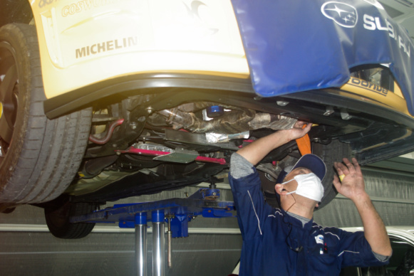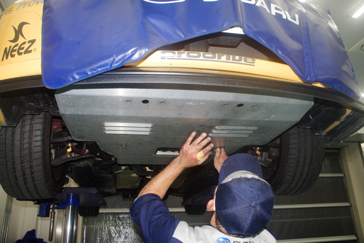 続きましてクルマをリフトアップし、アンダーパネルを取り外します。