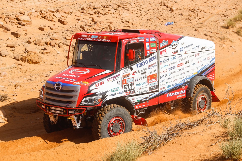 2022年のダカール参戦車、チームスガワラのハイブリッド搭載の HINO600です。