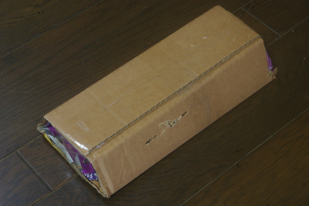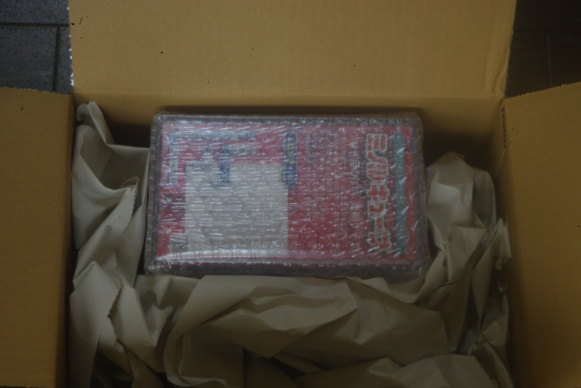 そのダンボールの囲いをバラしますと、スーパーマーケットかなにかの折り込みチラシでしょうか、紙の緩衝材が出てきました。