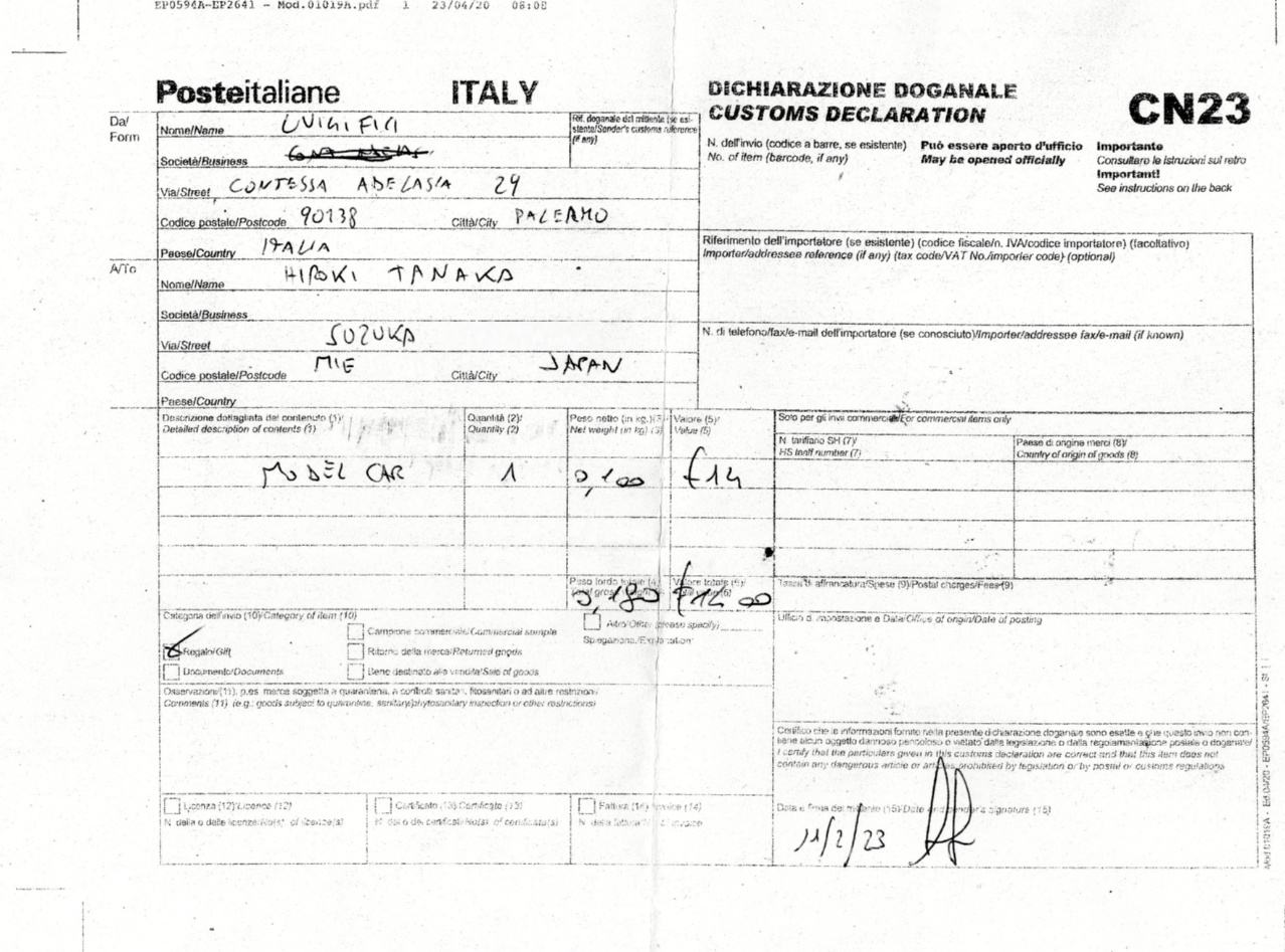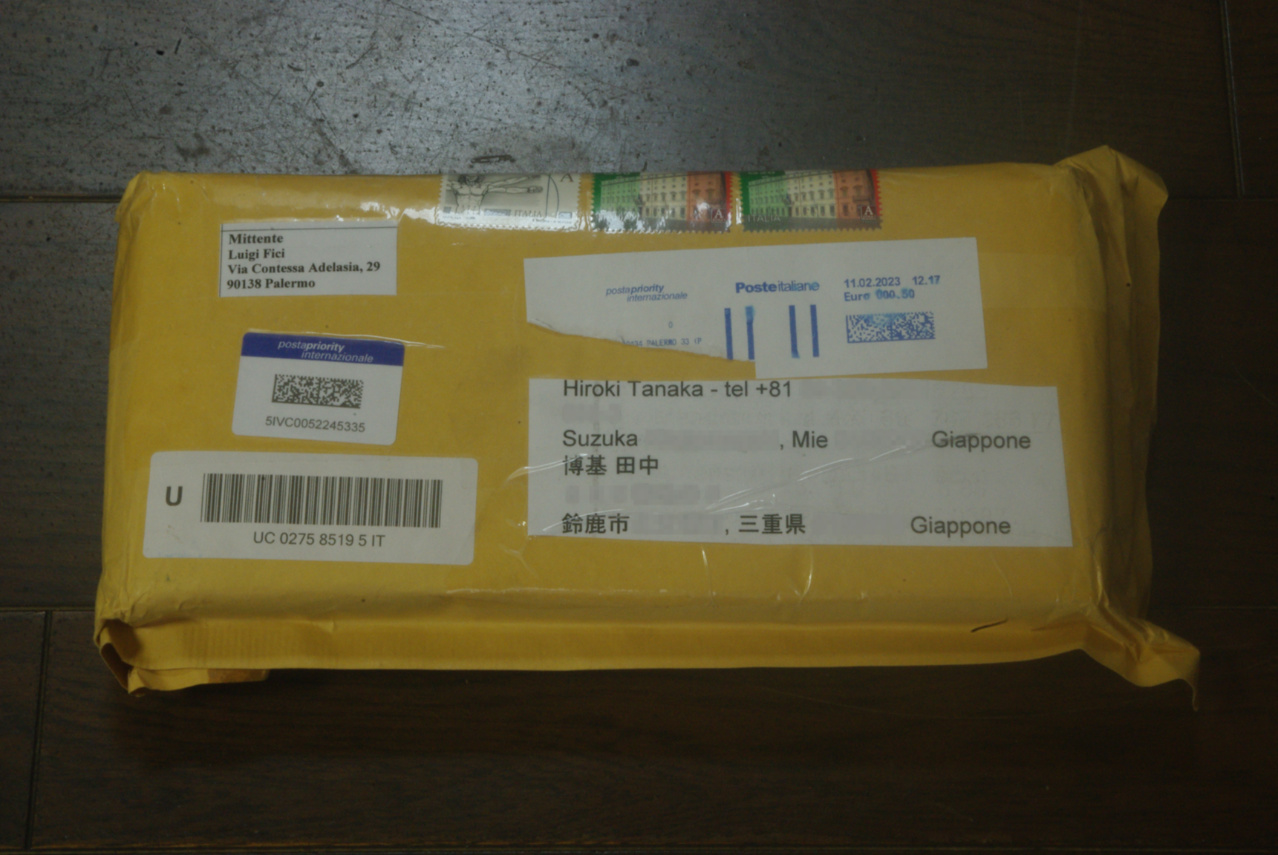 筆跡がかなり乱暴ですが、この送り状でイタリアから極東の島国まで正確に荷物が届けられるのですから、国際郵便というのはまったく大したものです。