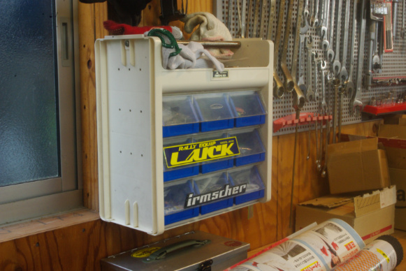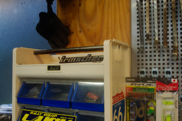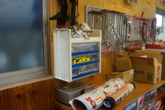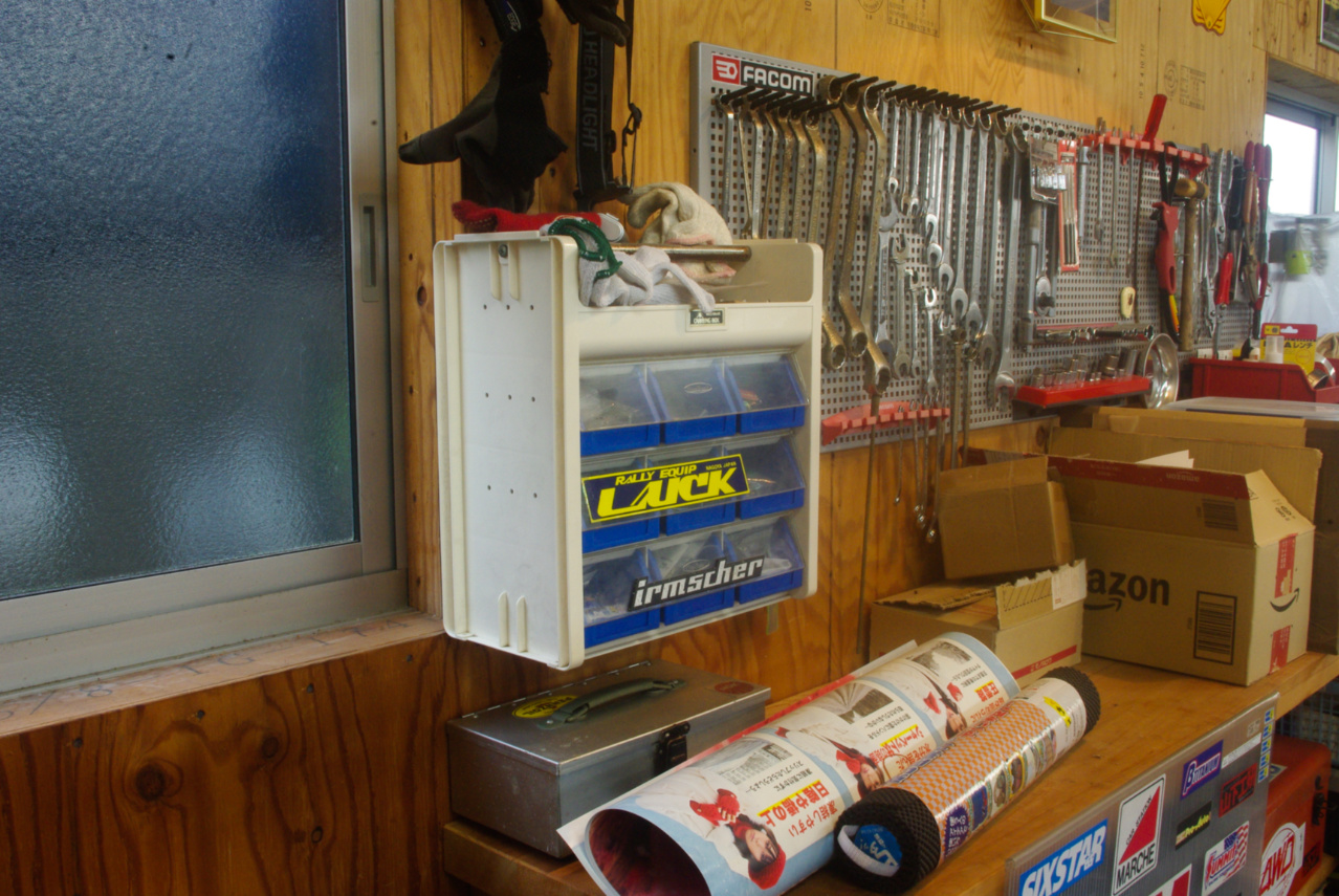 この画像中央の壁に掛けてある樹脂製キャリングボックス(パーツケース)にご注目下さい。