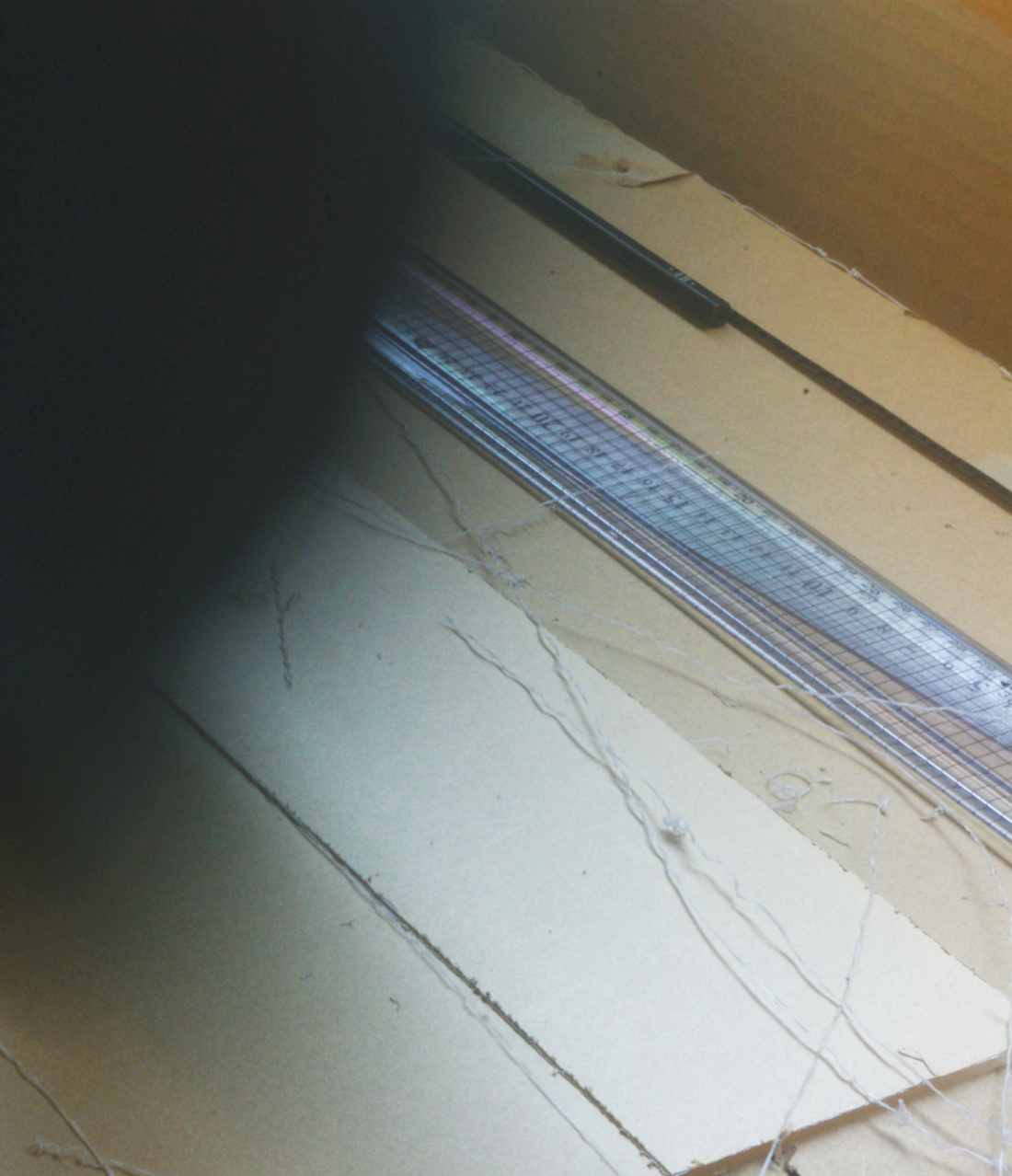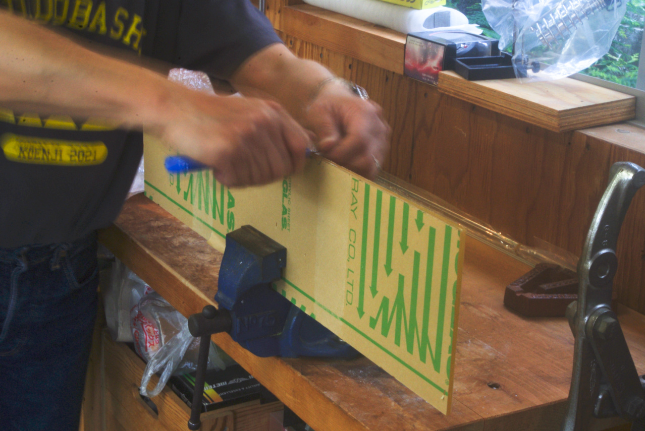 ひとつ前の作業と同様に、直角定規を当てて角度を固定しています。