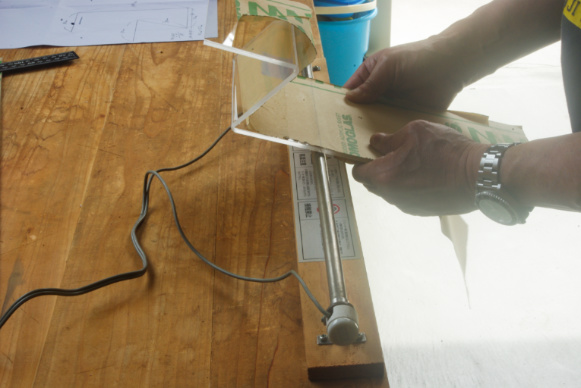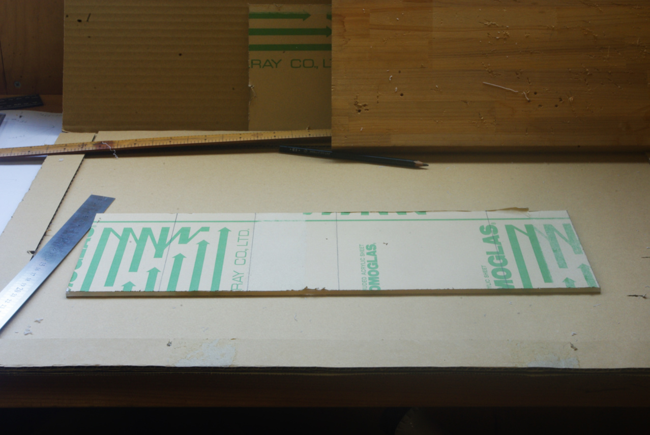 厚さが3㎜以上のアクリル板を曲げるときには、ヒーターを両面から当てた方が熱効率が高いので、このように両面に折り曲げ線を引いておきます。