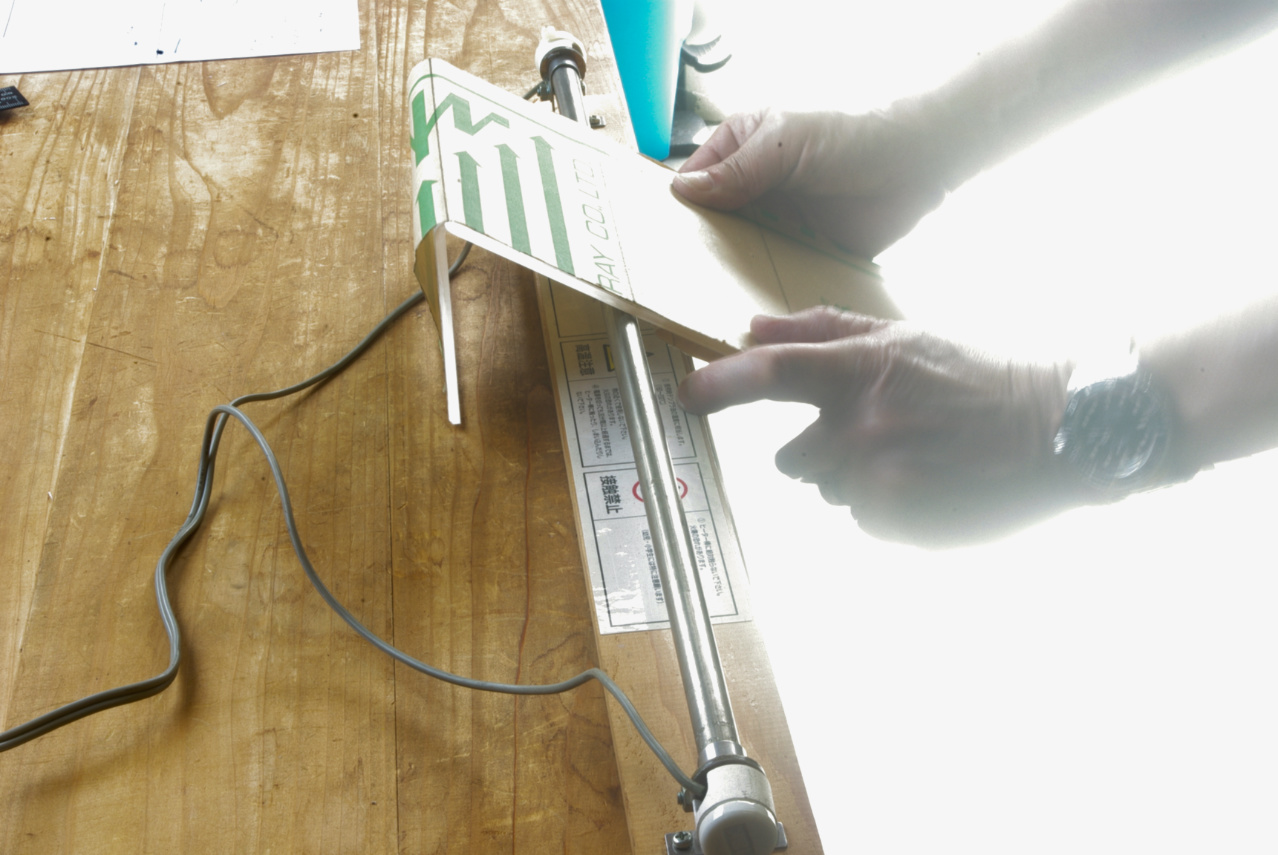 この後実際に曲げる背の部分に2回目のヒーターを当てますが、一回目に剥がしたペーパー(弱粘着性があります)は元に戻します。