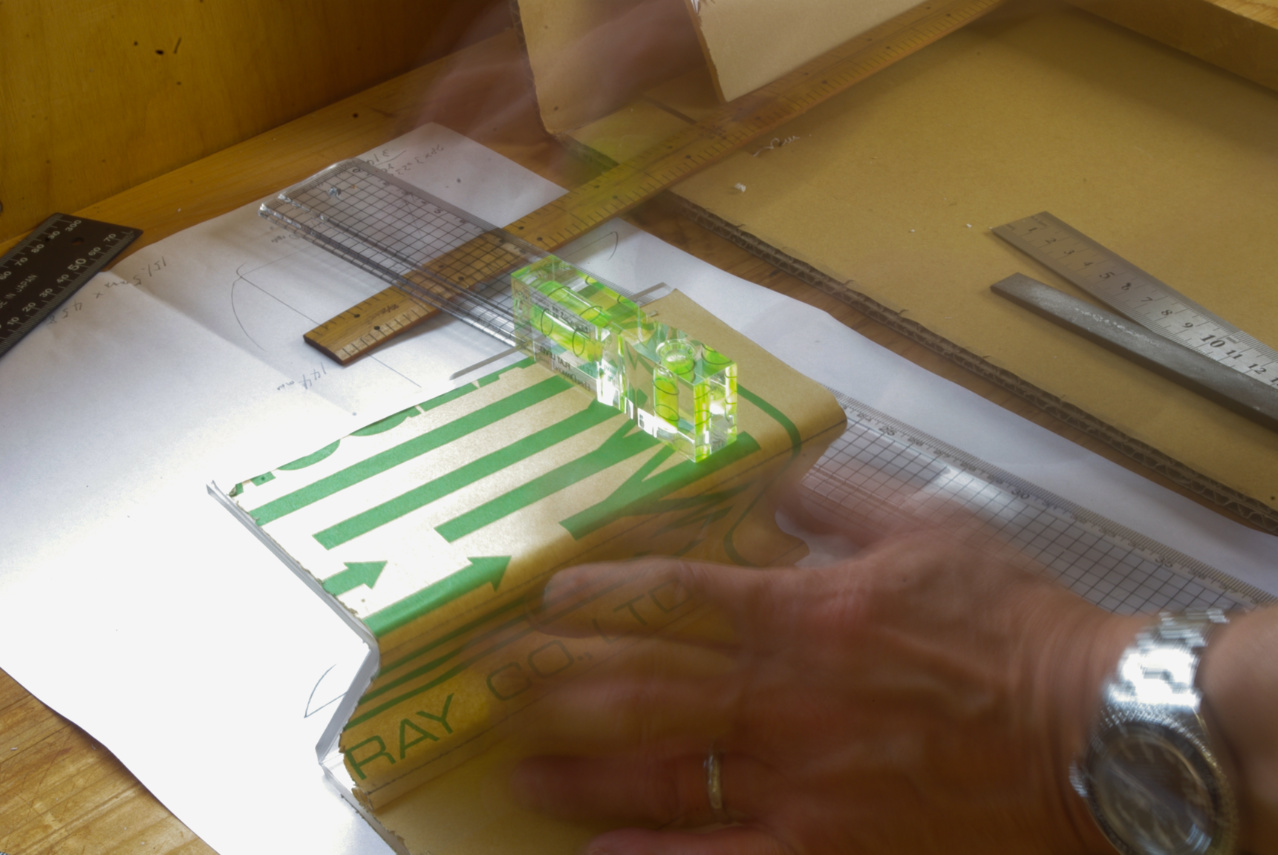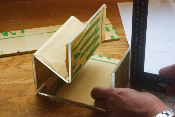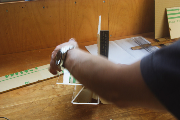 この部分は直角に立ち上げるだけですから、ご覧のように直角定規を当てて固定しました。