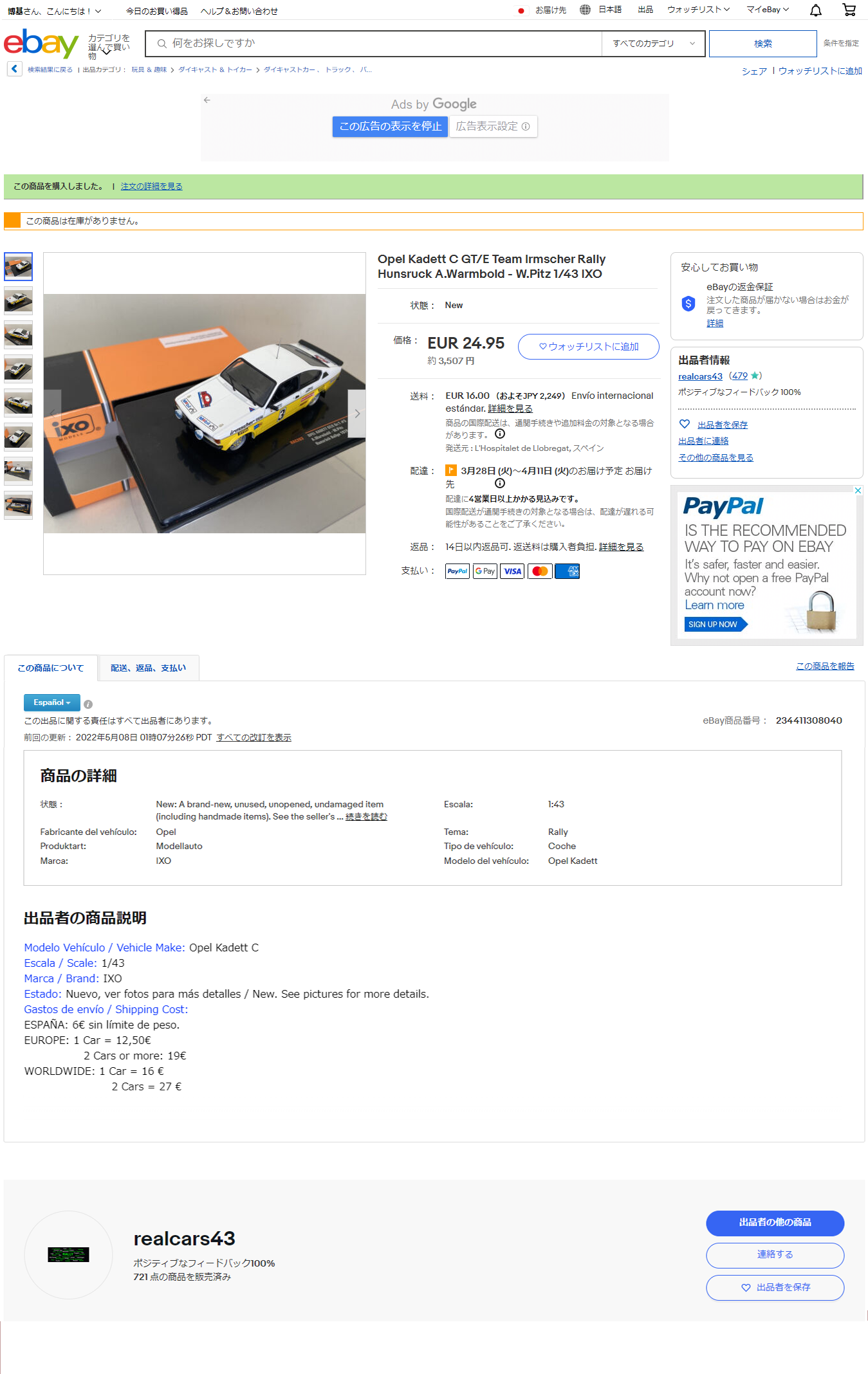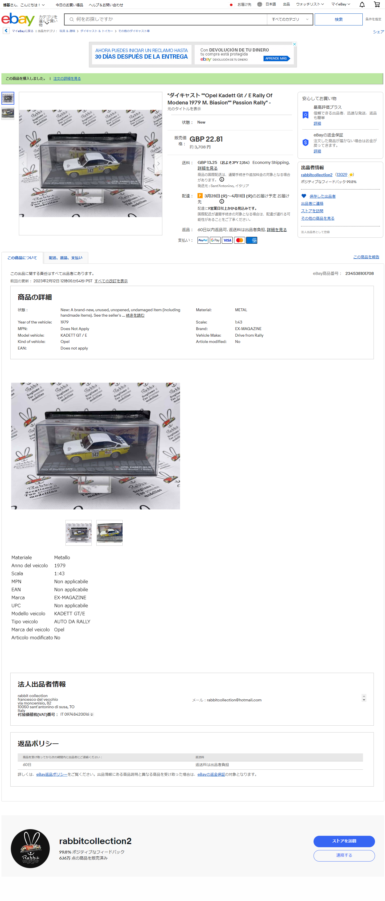 すでに上述していますとおりOPEL KADETT B ラリー仕様のミニカーではなく、私の愛車ISUZU Gemini ZZ-R coupé PF60の正真正銘兄弟車たるOPEL KADETT GT/E ラリー仕様を購入しようと、eBay USAを探しました結果、まずこのスクショのモデルを購入しました。