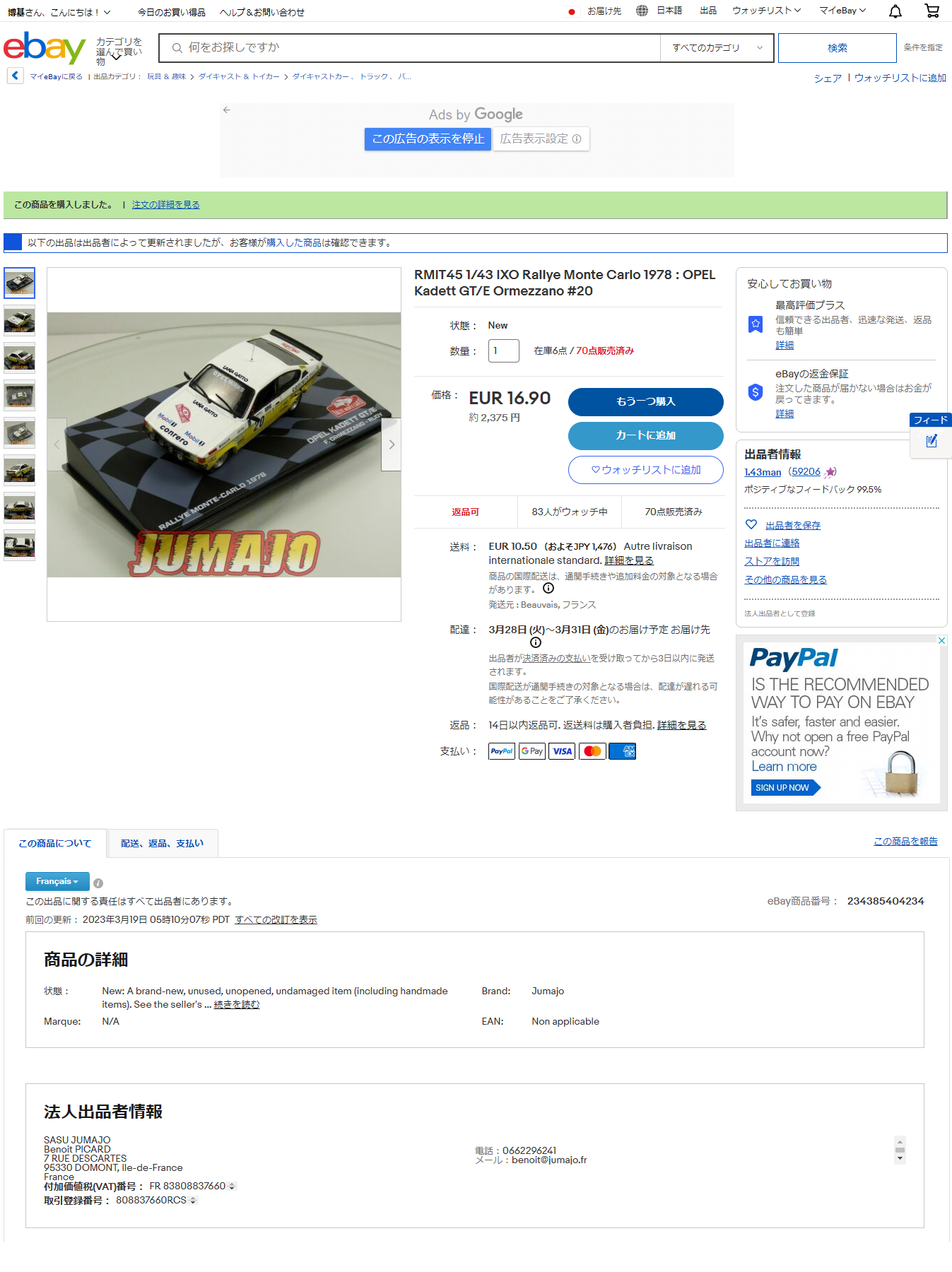 この日eBay USAにおいて左のスクショにありますRallye Monte Carlo 1978 OPEL KADETT GT/Eを購入しました。