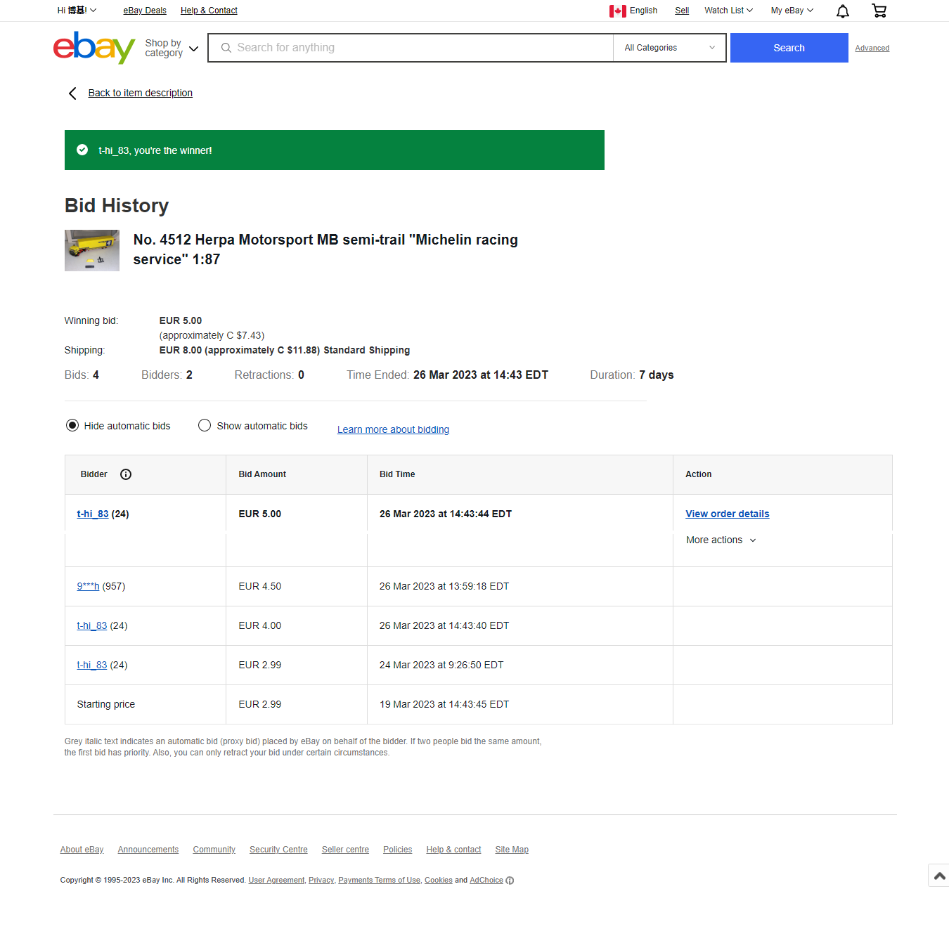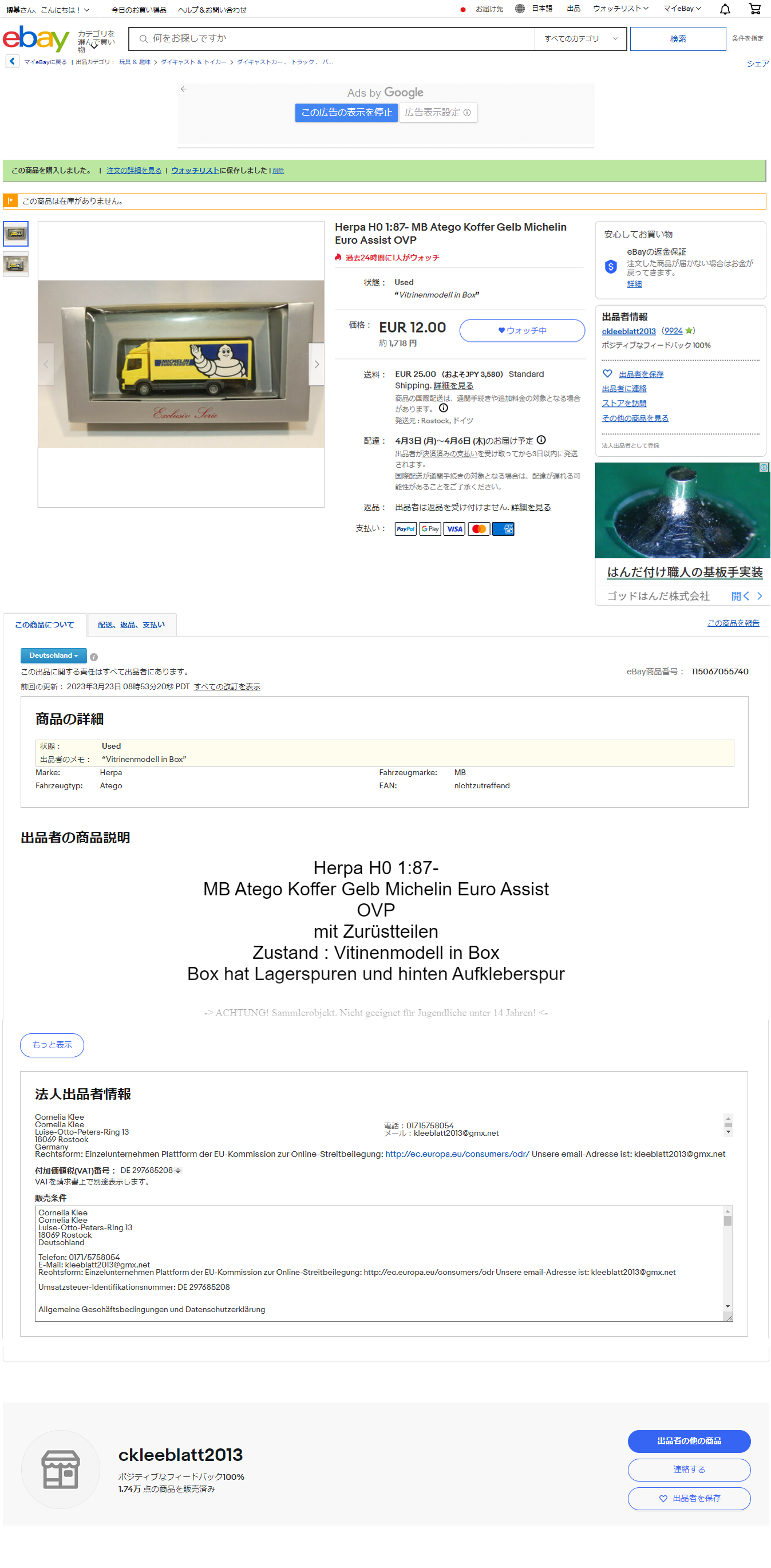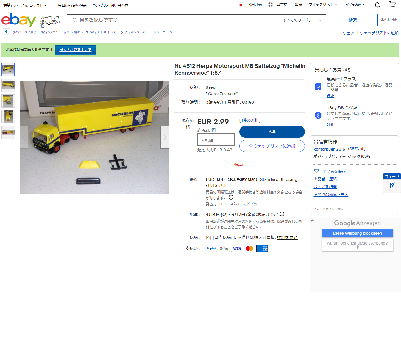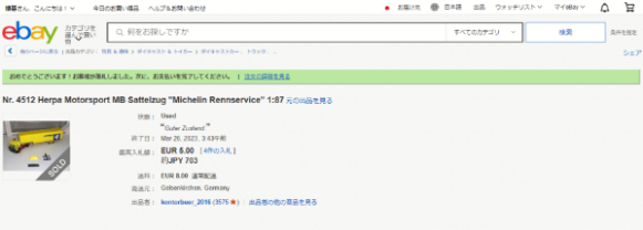 入札開始は現地の日付で3月19日で、まだ1件も入札がありませんでしたので私がこの日に最低入札価格€2.99、日本円で約420円で最初の入札を掛けました。