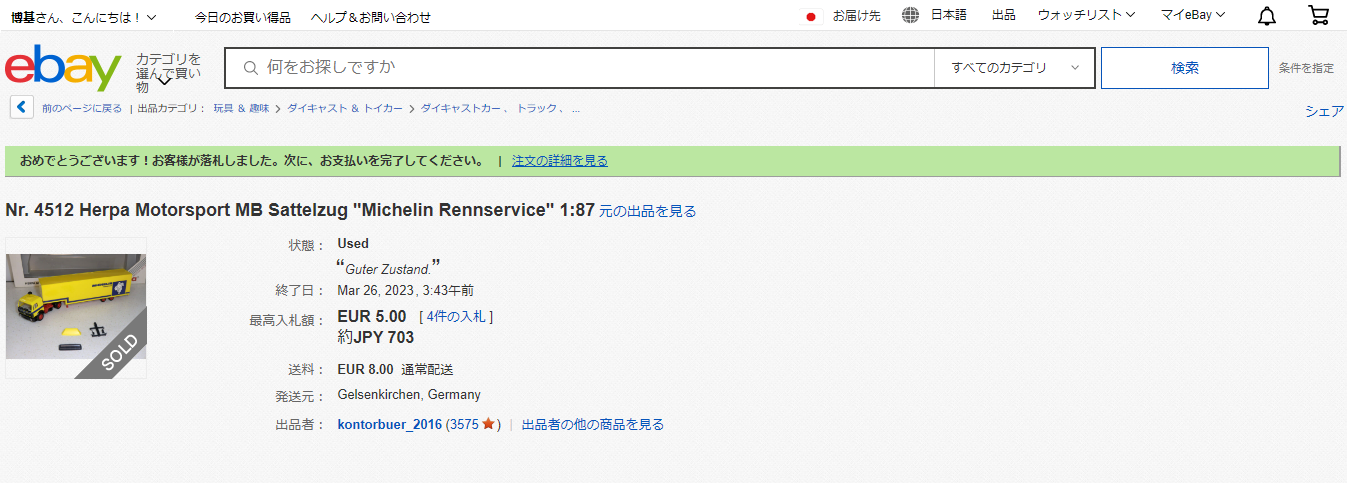 尚この履歴に記載の入札日時は現地(たぶん米国)の日付時刻ですので、私が落札した日は日本時間で3月27日です。