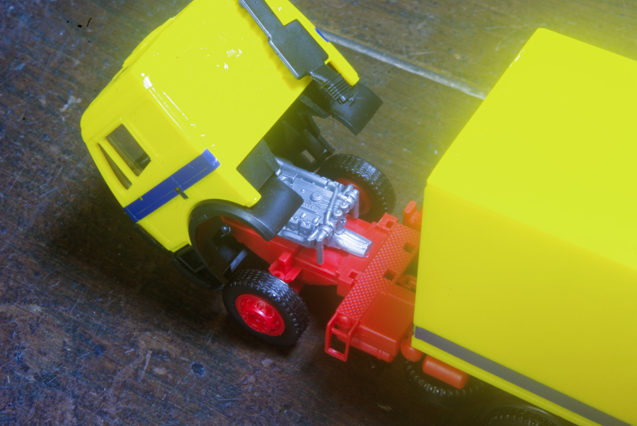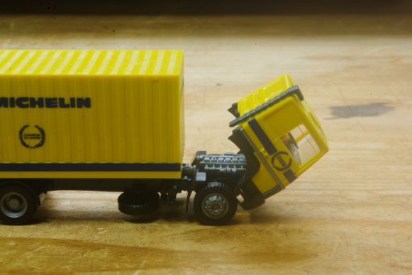 普段からあまりミニカーの可動部分には関心が薄いのですが、キャブオーバーのコックピット部分の背後からエンジン部がチラッと見えましたので、恐る恐るキャビンの後ろ側を持ち上げてみました。