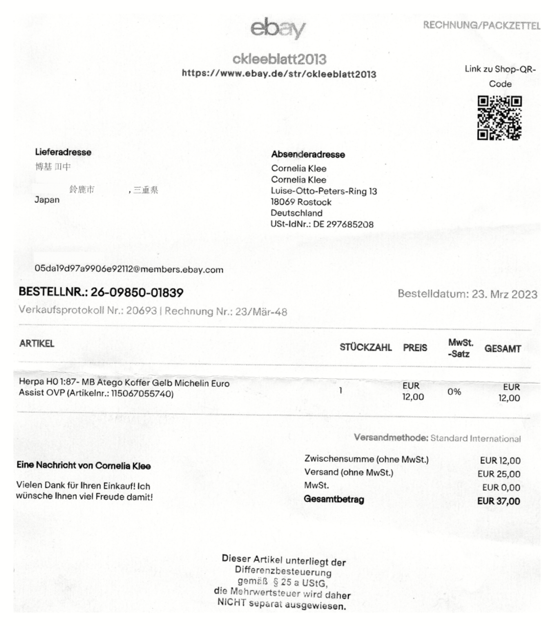 さらにこの発送元(独国)もご多分に漏れず宛名と住所のドイツ語(アルファベット)表記が必要でしたので、eBayメッセージフォームを通して個人情報をお伝えしました。
