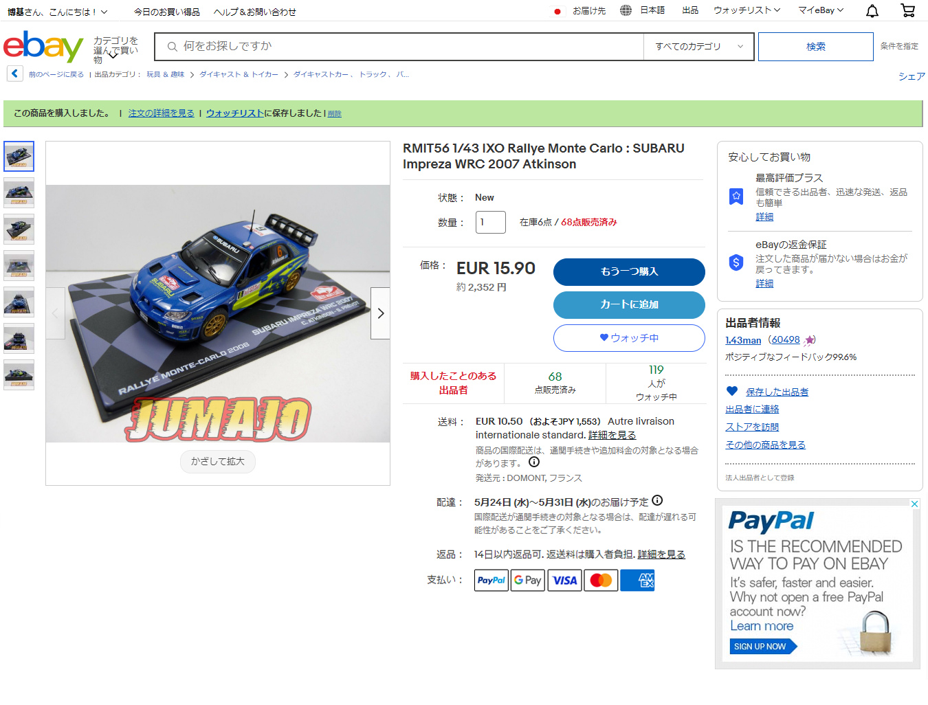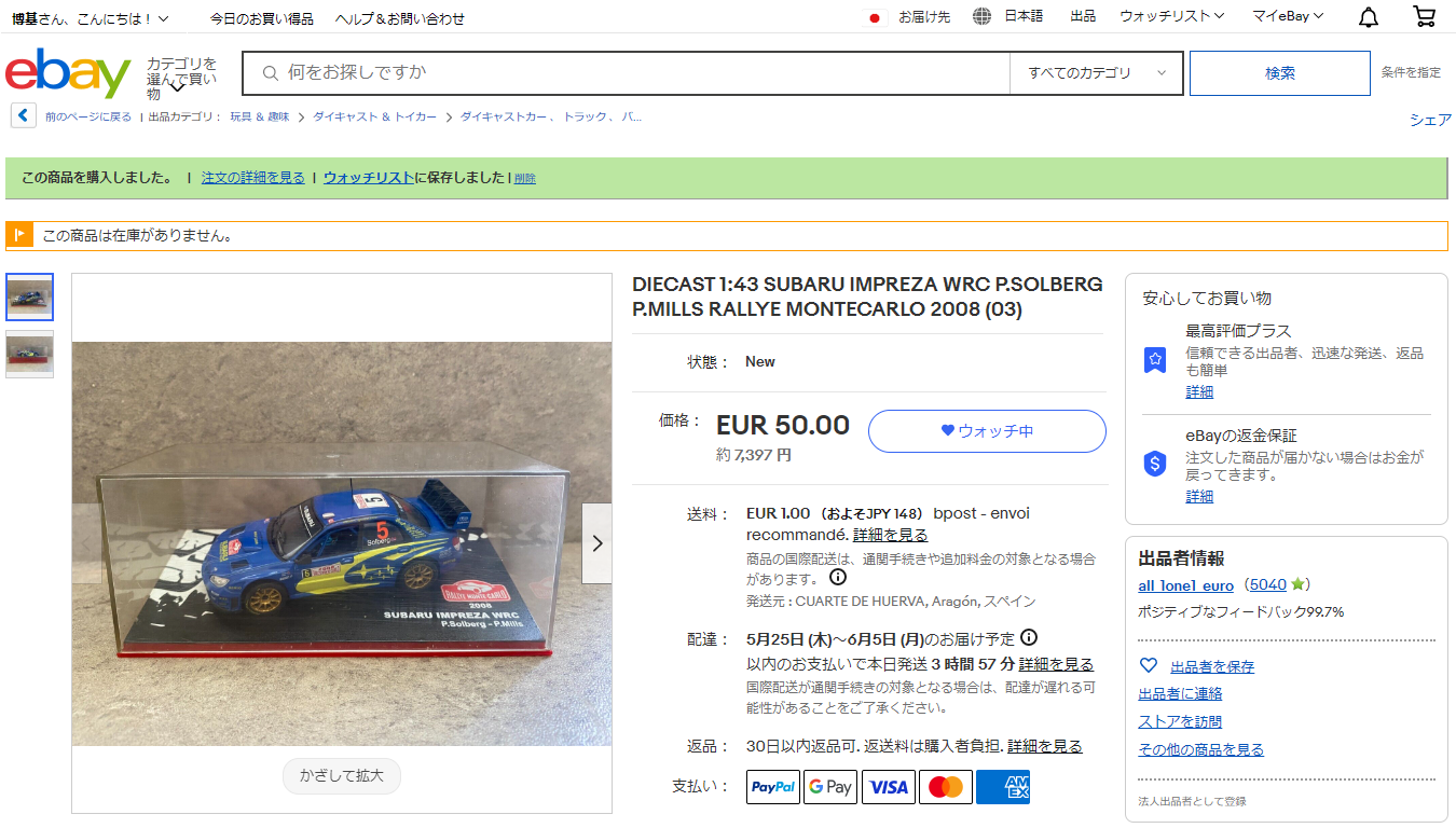 上のSUBARU Impreza S12B WRC 2007アトキンソンモデルを注文した同日に、このSUBARU Impreza S12B WRC 2007ソルベルグモデルも発注しました。
