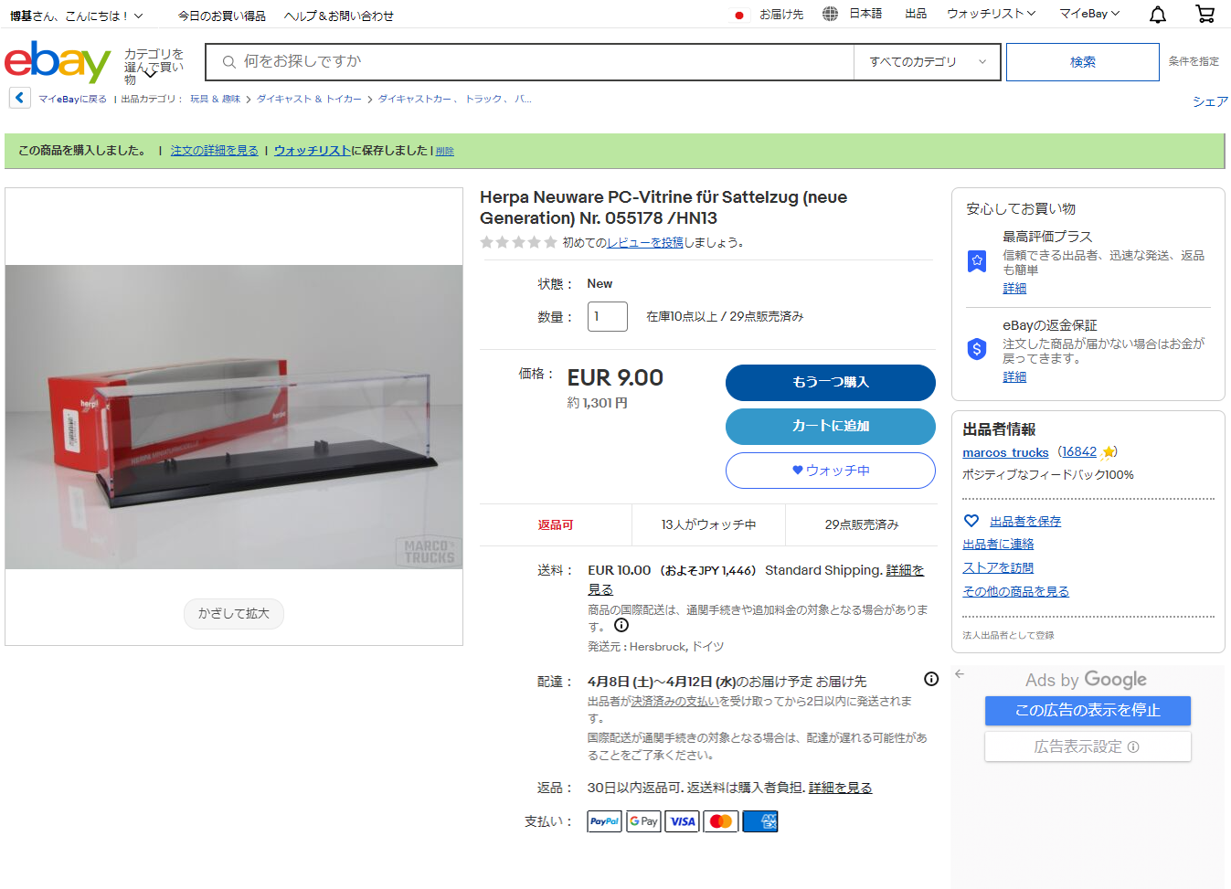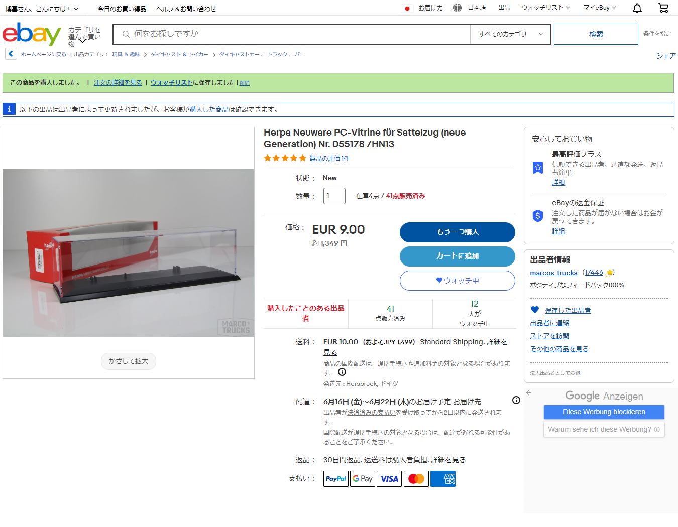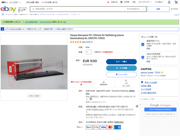 実はこれよりももっと前、5月22日にとあるeBay USA出品者よりHerpa 460125 Epsilon Vitrine XL für Lkw´s 1/87 H0 NEU OVPと云うディスプレイケースを購入し、24日に発送連絡を受け後は到着を待つばかりの状態でした。