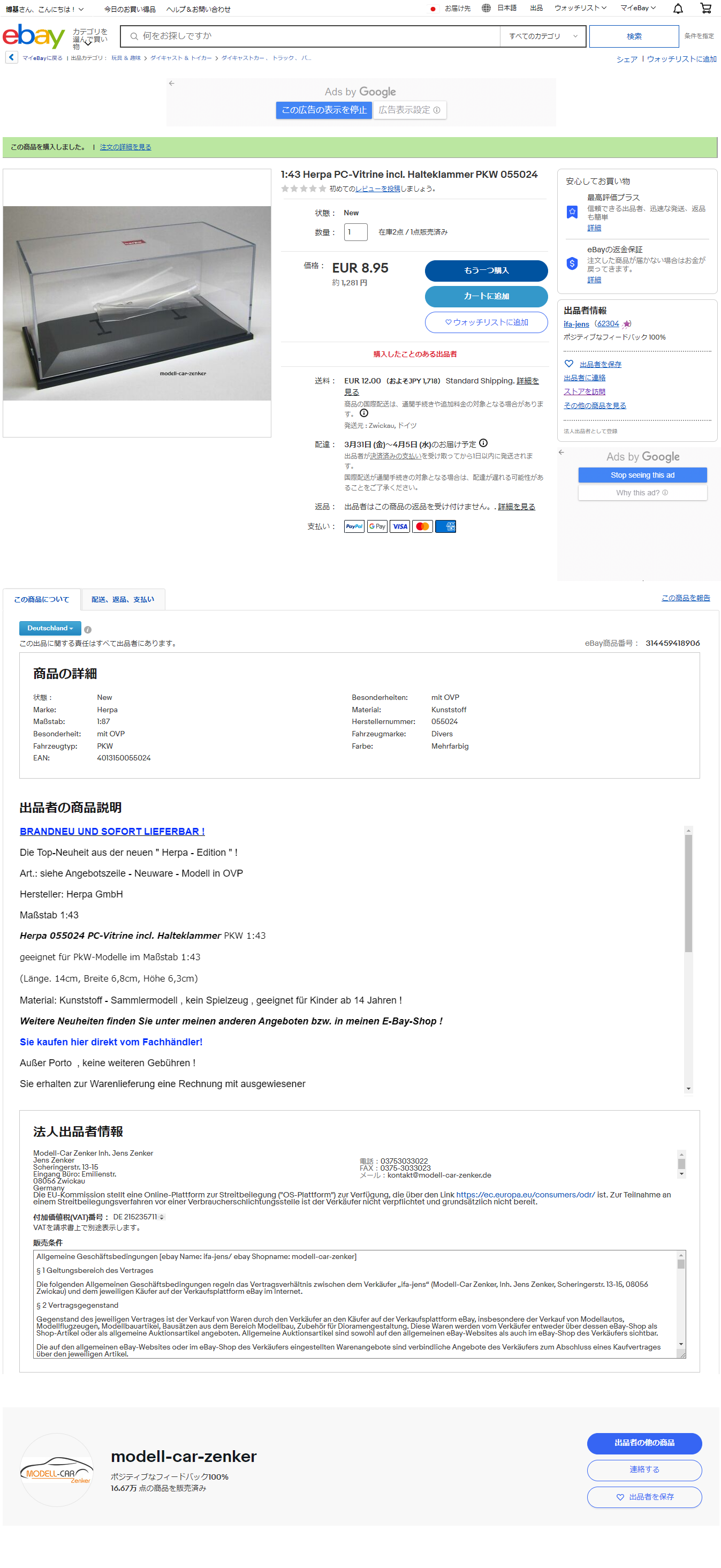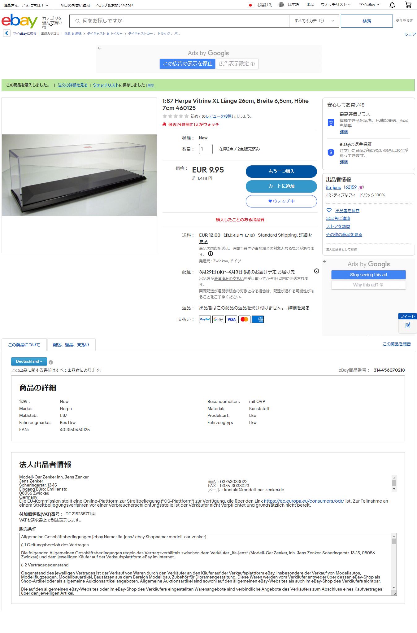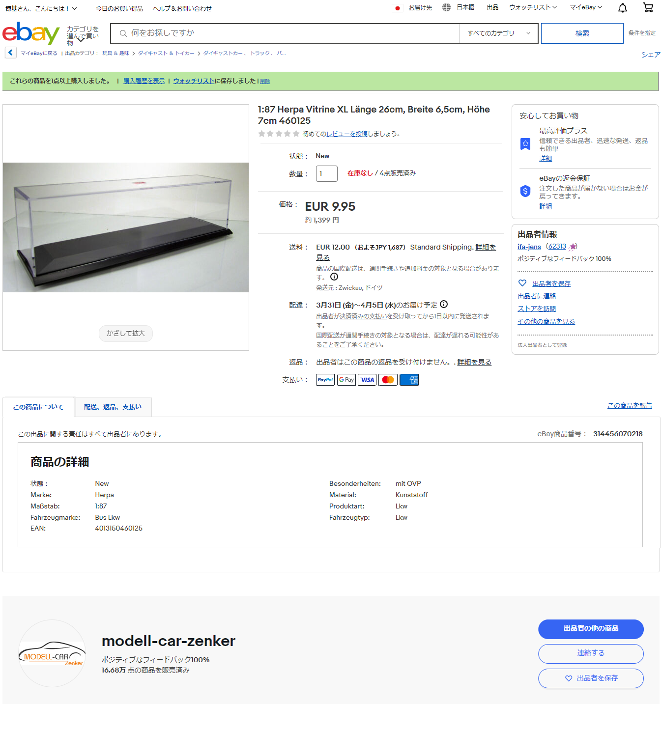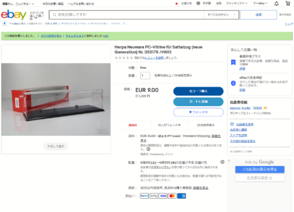 この日は同じくこのeBay USAにてHerpa H0 1/87- MB Atego Koffer Gelb Michelin Euro Assist OVPを購入したことに併せて、この1/43 Herpa PC-Vitrine incl. Halteklammer PKW 055024ディスプレイケースも購入しました。