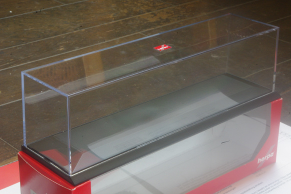 これは先に購入しました1/87 Herpa Vitrine XL Länge 26cm, Breite 6,5cm, Höhe 7cm 460125ディスプレイケースと同じサイズで、台座の形体が異なりますので若干の懸念はありましたが、このときは既にHerpa Vitrine XL Längeは売り切れていましたので、それに替わる唯一の選択肢がこのHerpa Neuware PC-Vitrine für Sattelzug (neue Generation) Nr. 055178 /HN13ディスプレイケースと云う訳です。