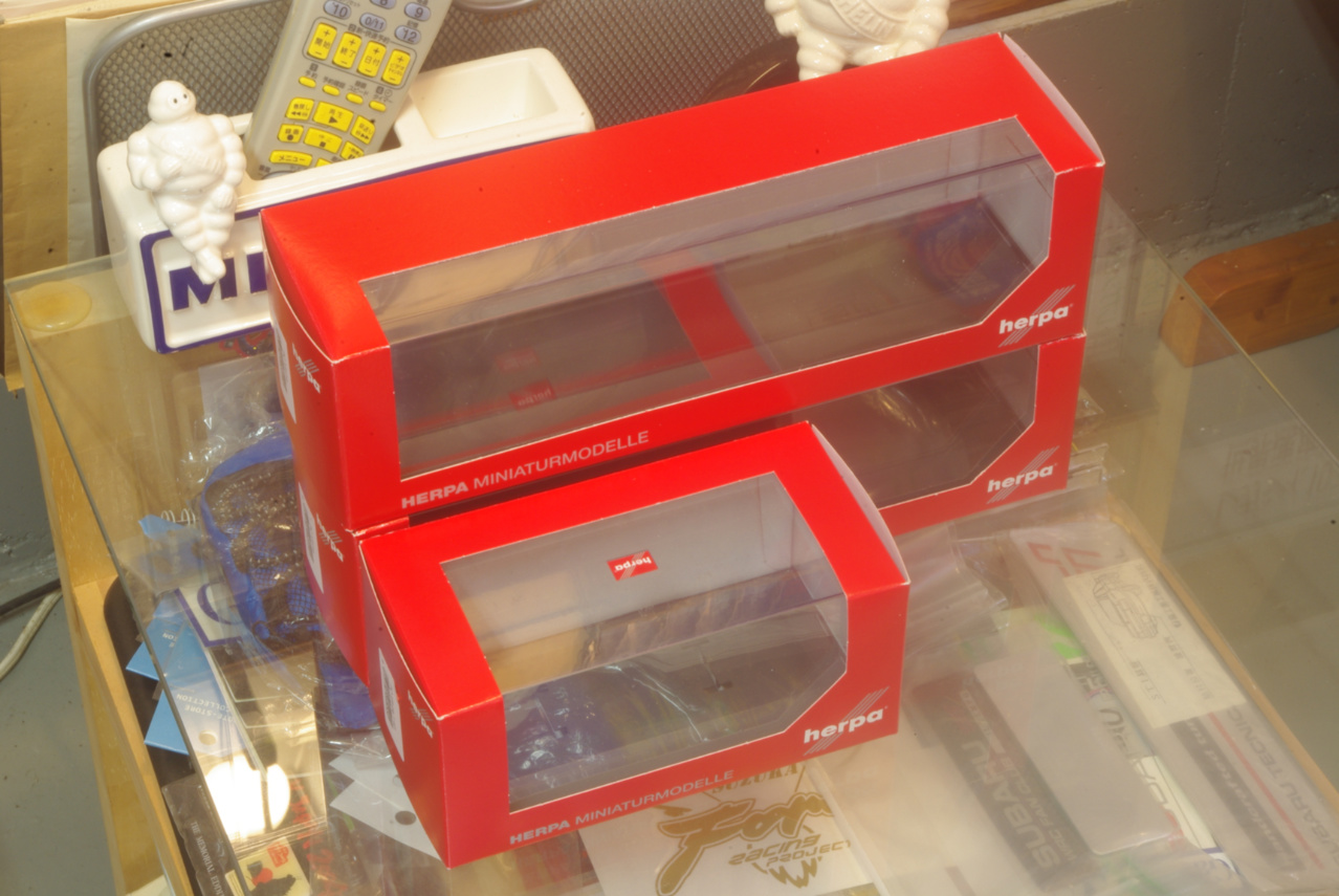 ここで丁度注文してありましたこの2台のHerpaMiniature Carが届いてましたので、先に届いていたHerpa製ディスプレイケースに試験的に収めてみることにしました。