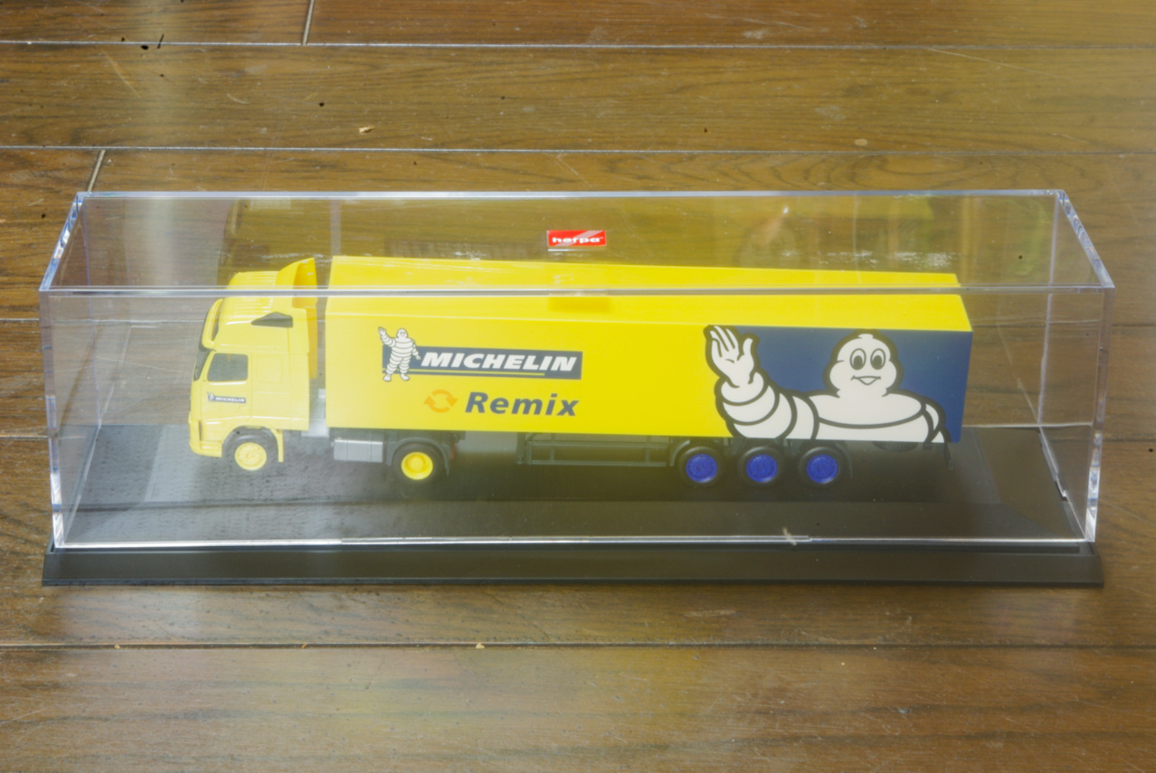 左の画像は最後に購入しましたHerpa Michelin Modell VOLVO 1/87ですが、試しにこのHerpa Neuware PC-Vitrine für Sattelzug (neue Generation) Nr. 055178 /HN13ディスプレイケースに収めてみました。