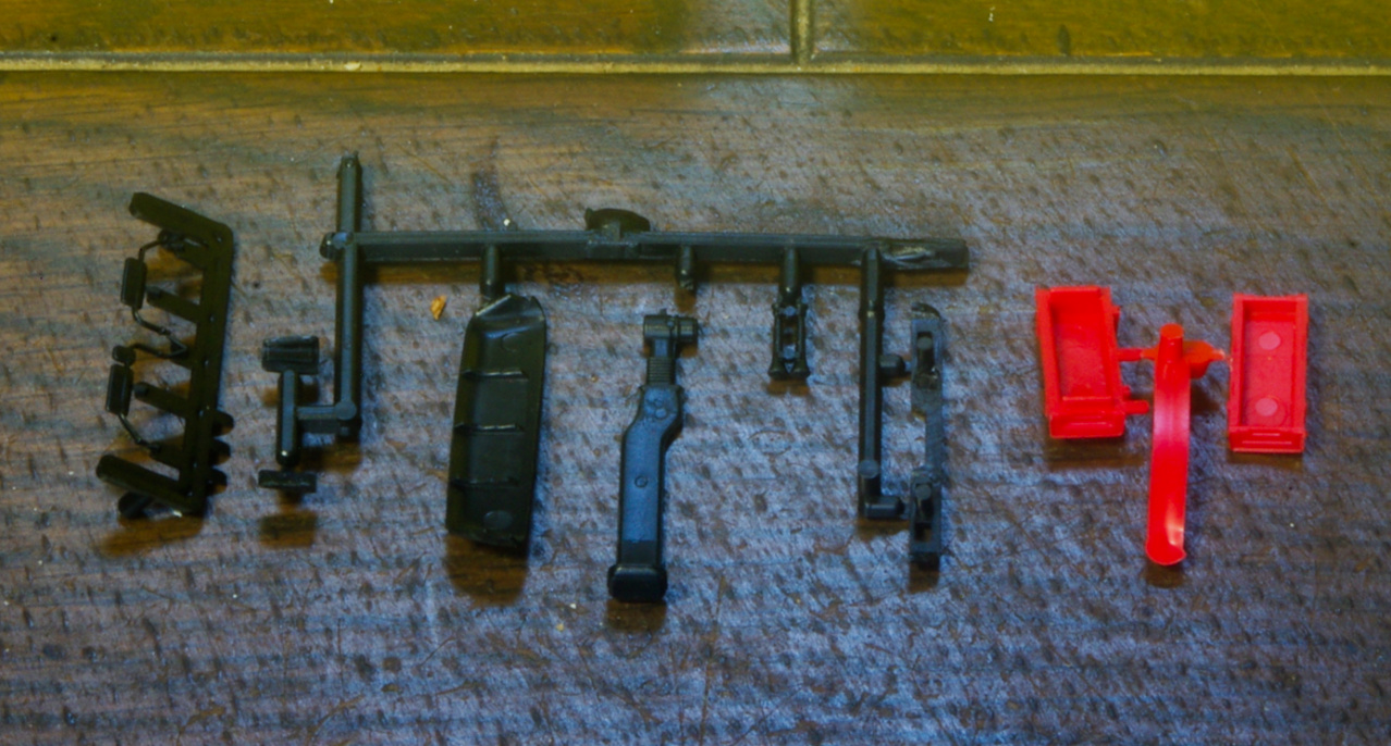 左から左右ドアミラー、たぶんフロントグリル両サイドのウィンドリードプレート、フロントシールドサンバイザー、排気マフラー、ファンファーレホーン、フロントアンダースポイラー、そして赤いパーツはたぶんシャーシの付属パーツ(燃料タンクか?)だと思われます。