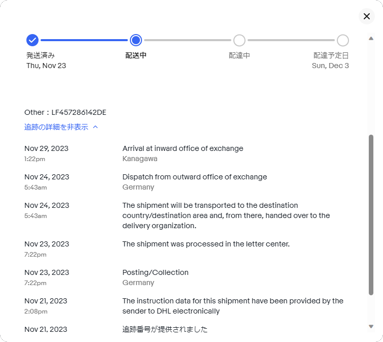ということで左のスクショですが、荷物は一つにまとめられて11月21日に発送されたことが確認出来ました。