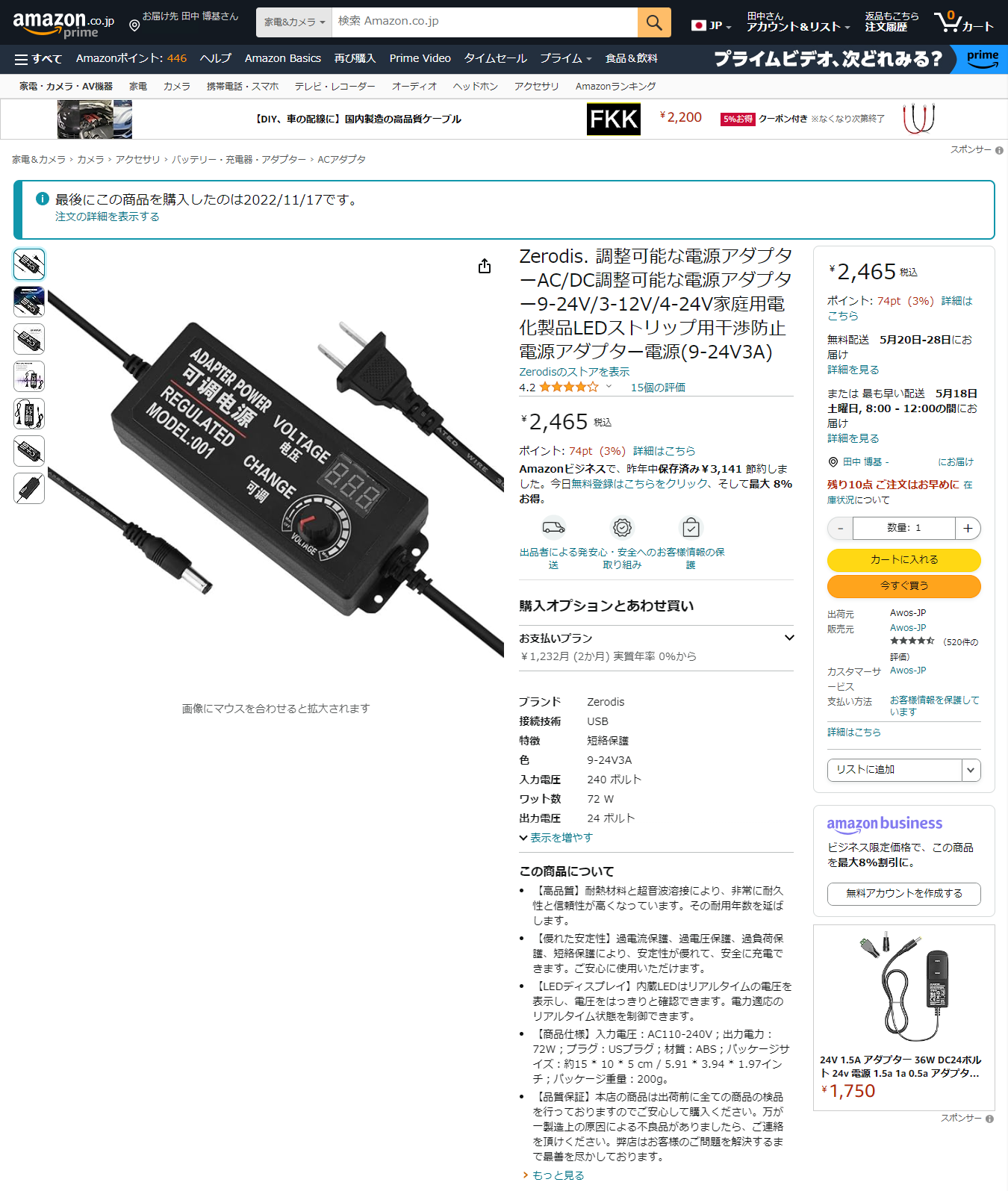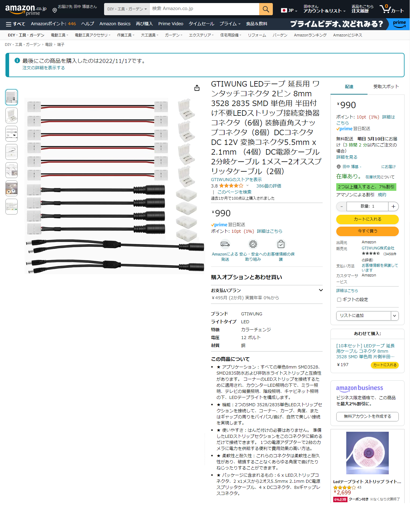 また過去に遡りますが、この日左のスクショの商品/LEDテープライトを初めて購入しました。