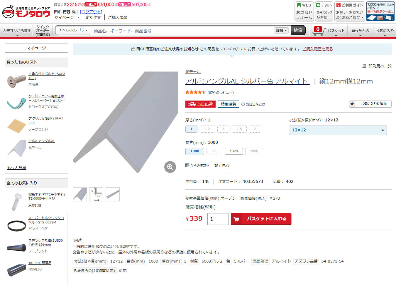 そしてまず必要になったパーツは左のスクショにあるアルミLアングルバーです。