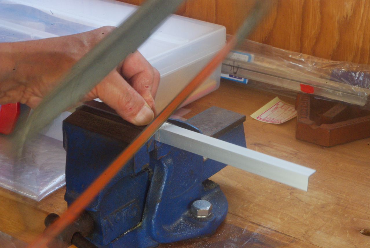切り詰めたアルミLアングルバーの長さ(約870㎜)を確認しています。