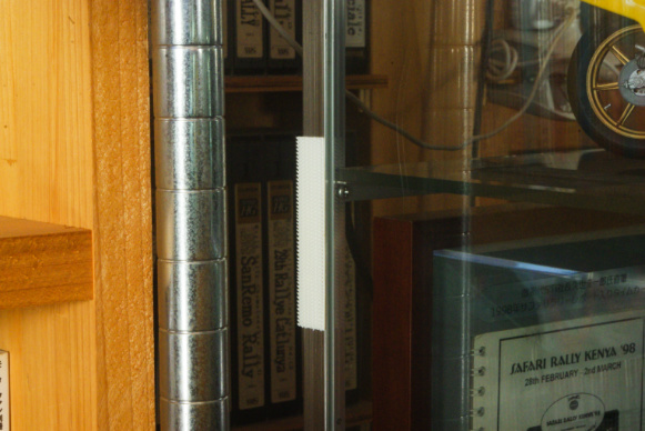 これは上記のマジロックセットループ側シールをショーウインドーガラスケースの前面支柱(正面に向かって左側)に貼り付けたときの画像です。