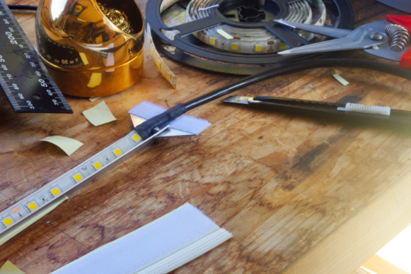 画像は既にLEDテープライトに電源ケーブルを結線した状態です。