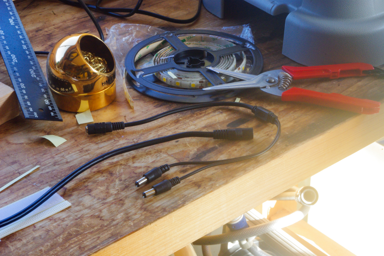 また既に画像では電源コードもLEDテープライトに接続していますが、+-両極に半田付け刷る際に電源ケーブルのリード線が太いスケアでしたので、剥き出たリード線の芯線に被せてあるハンダがなかなか溶けなくて半田付けには手こずりました。