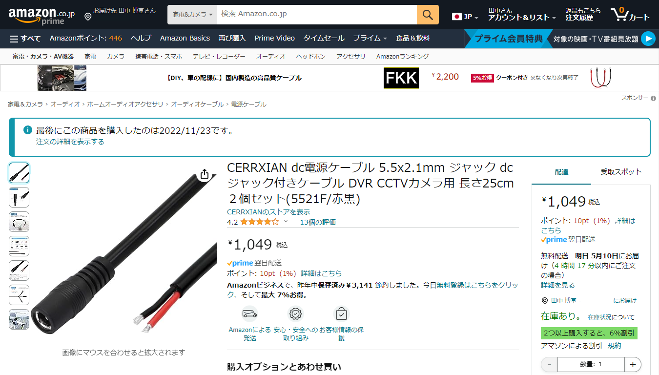 この電源ケーブル(ジャック付き)も上記のLEDテープライトと同じ時期に購入しました。