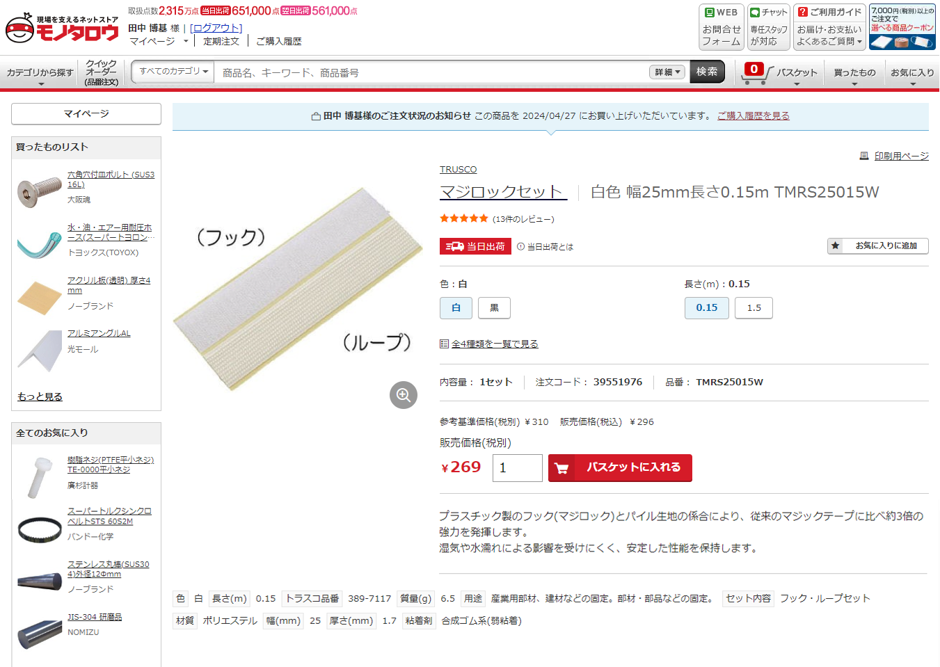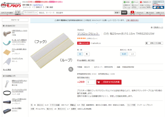 何故このマジロックセットを採用したかと申しますと、MonotaROのマジロックセット販売ページに