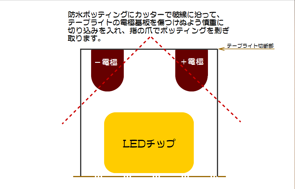 特にテープライト基板に盛ってある防水用の樹脂ポッティングを剥がして、切断面の+-両電極端子を剥き出しにするときのポイントは図解で説明しています。
