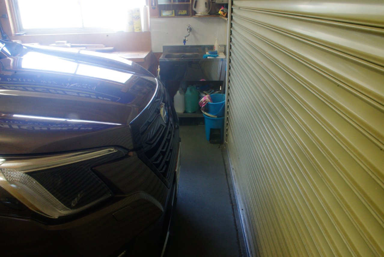 このフロント側のシャッターまでの隙間は、特にギリギリという訳では無く、偶々リア側に余裕を残して駐めましたので、これくらいのスペースになりました。