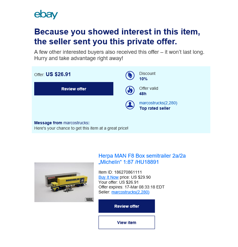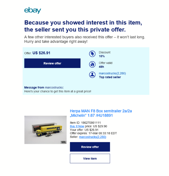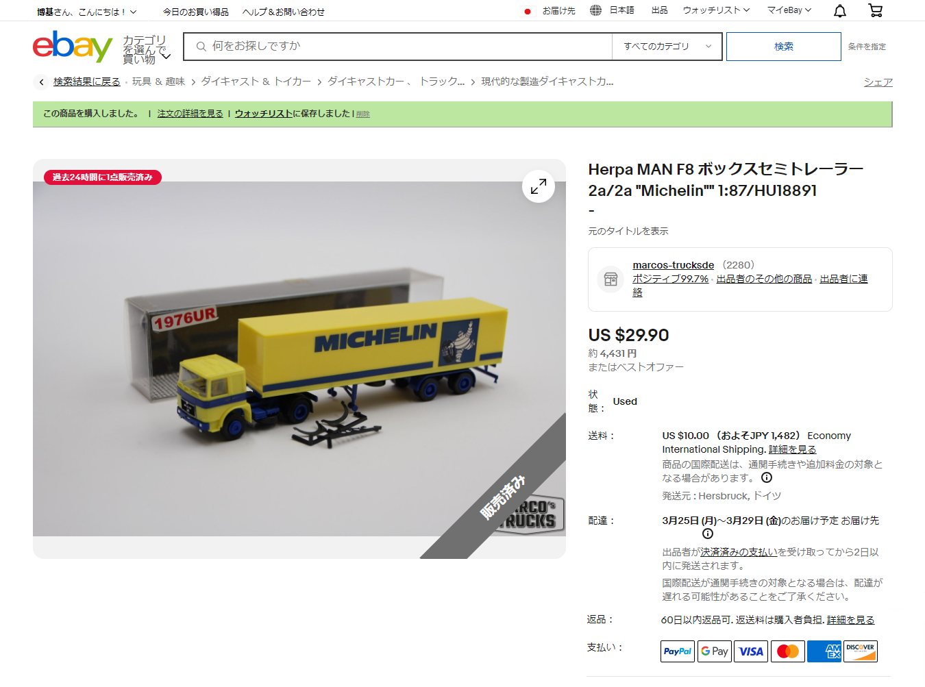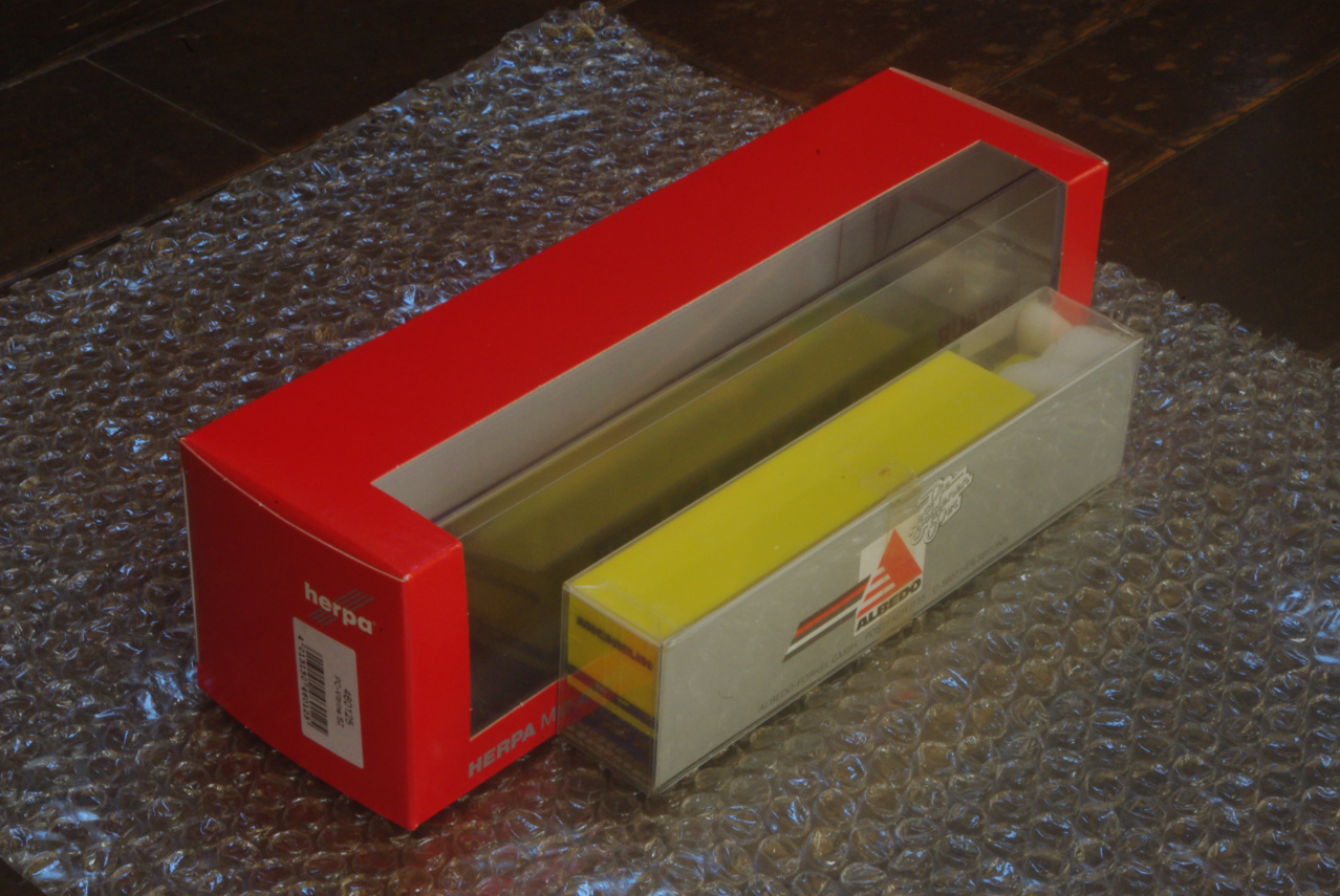 ただしeBay USA の商品タイトルにあるHerpa MAN F8 Box semitrailer „Michelin“ 1/87 の文言は、不思議なことにどこにも見当たりません。