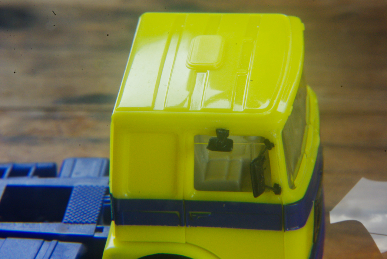 大型トラックの助手席の横の部分は大きな死角になりますのでそれを補うためのミラーですが、コレなどはドアミラーよりさらに小さく当然ルーペで拡大しながら接着作業を行いましたがそれでもなかなか大変でした。
