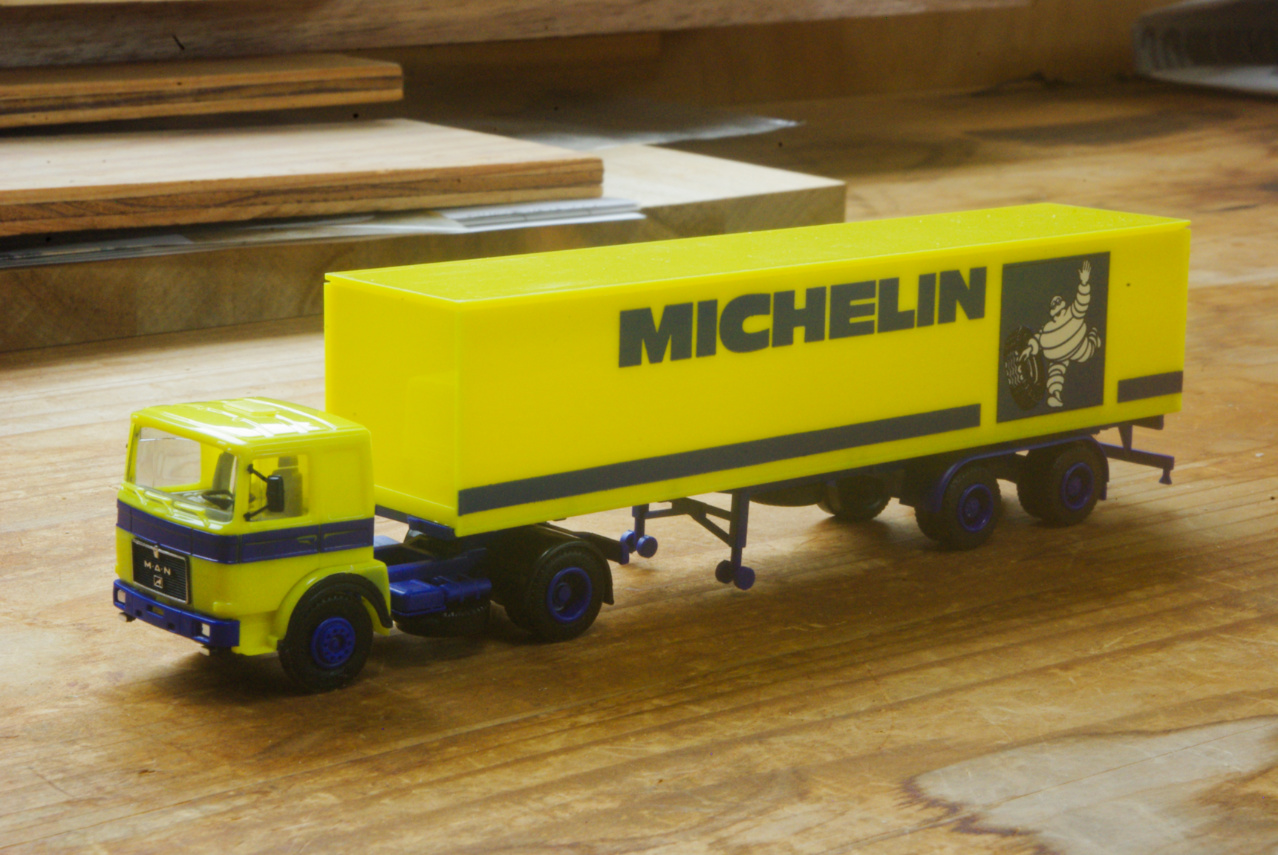 Wiking製 Fahrzeugmode Mercedes 1626 Sattelzug "Michelin" はとても印象深い一台でしたし、たぶんそれとほぼ同年代とおぼしきこのHerpa MAN F8 Box semitrailer „Michelin“ 1/87 は、これこそが