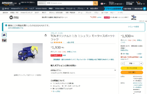 例えば参考までにこのTNCオリジナルトミカ ミシュラン モータースポーツトラックを価格調査した結果、6月1日現在Amazonにて4,480円が一点、驚きの10,680円が一点確認出来ました。