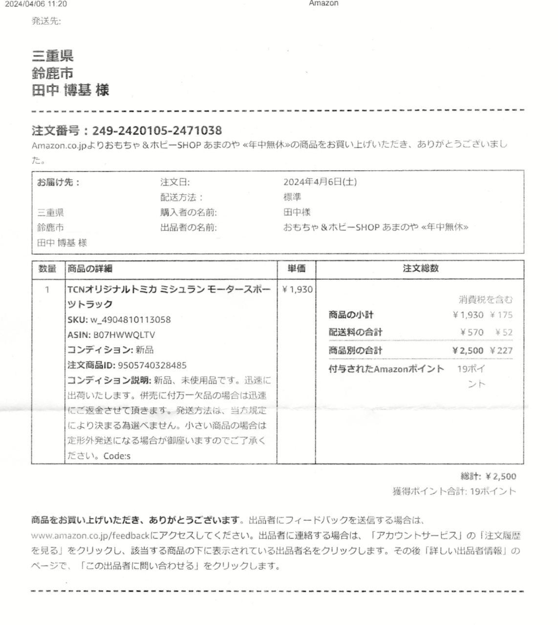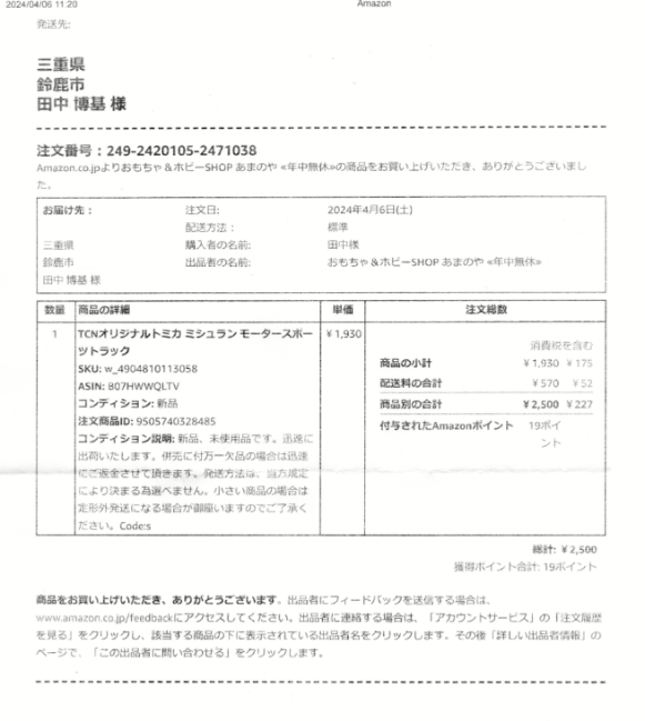 左は同梱されていた注文明細書です。