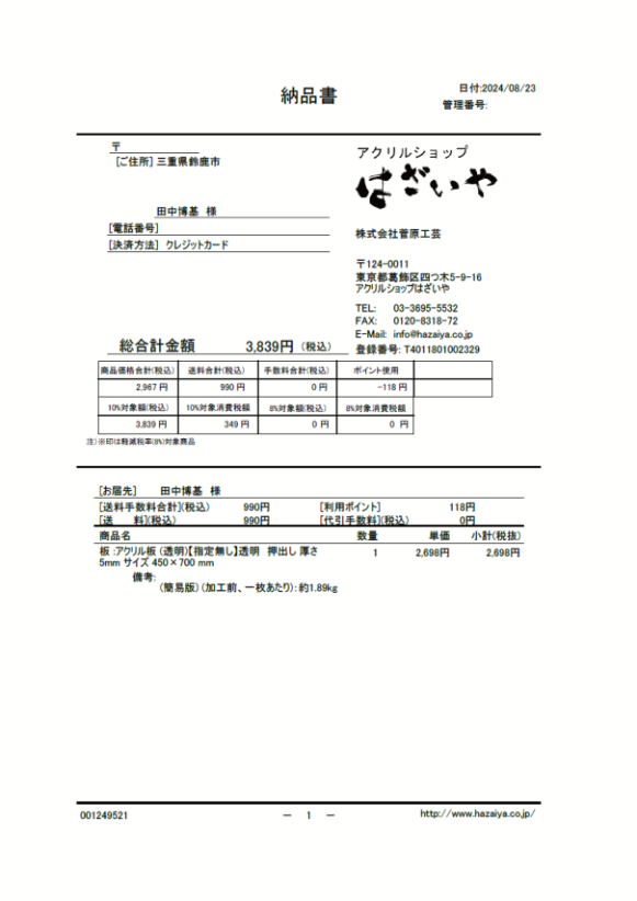 この日はいつもアクリル板の工作時にお世話になっているアクリルショップはざいやに、厚さ5㎜の大判アクリル板を注文しました。