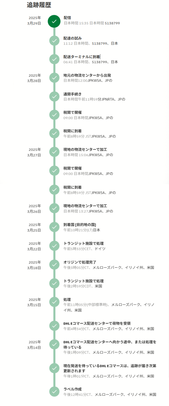 どれほど複雑な輸送経路であったか、DHLサイトの追跡履歴のスクショを掲載しておきますので、興味のある方はどうぞご確認下さい。