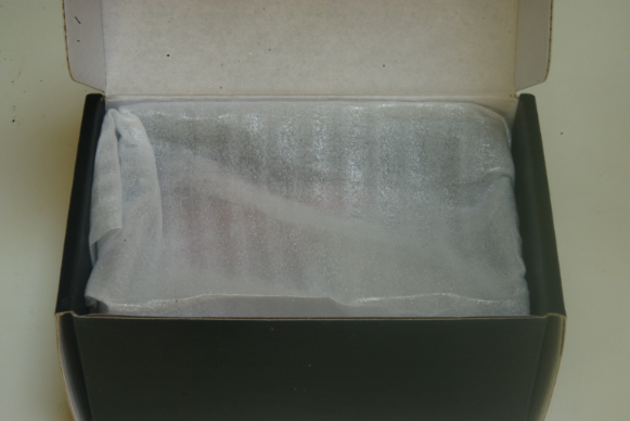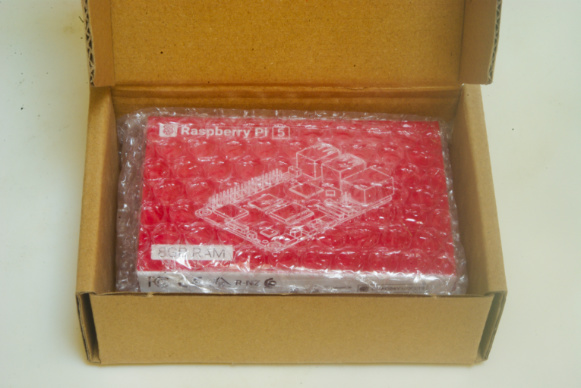 梱包の小さなダンボール箱の蓋を開けると、エアーキャップシートに包まれたPaspBerry Piのお馴染みの赤いオリジナルパッケージが姿を見せました。