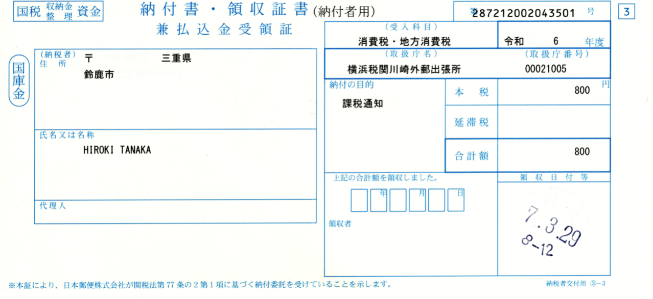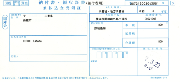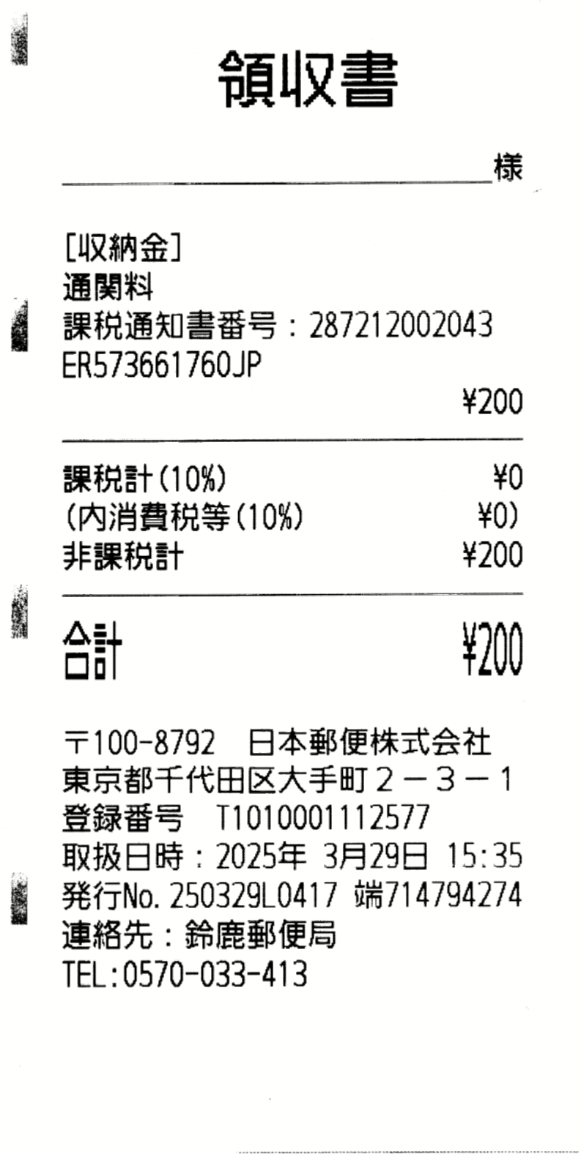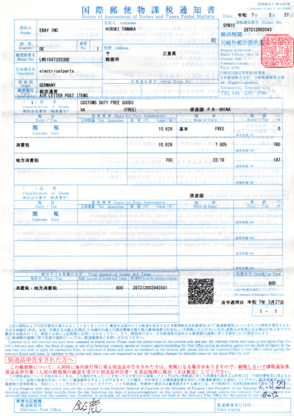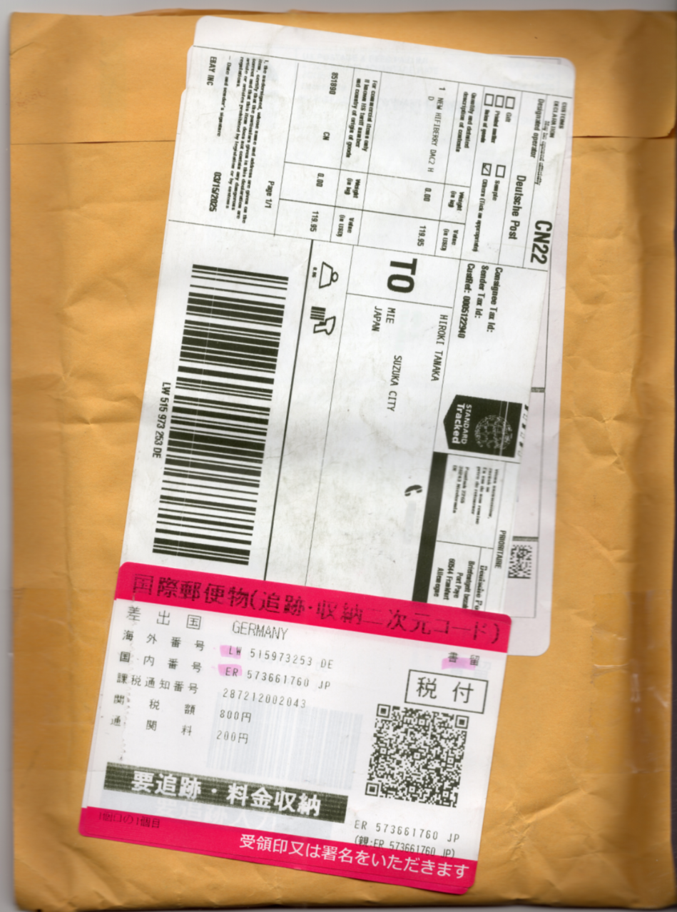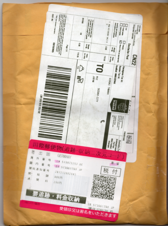 ここにも差出人はドイツとなっていて、関税額は800円、通関料としてプラス200円の計1,000円を支払いました。