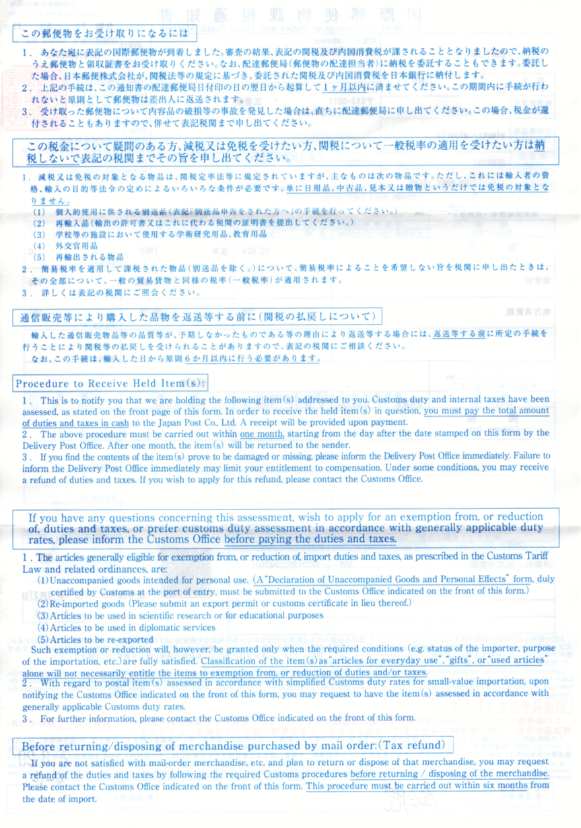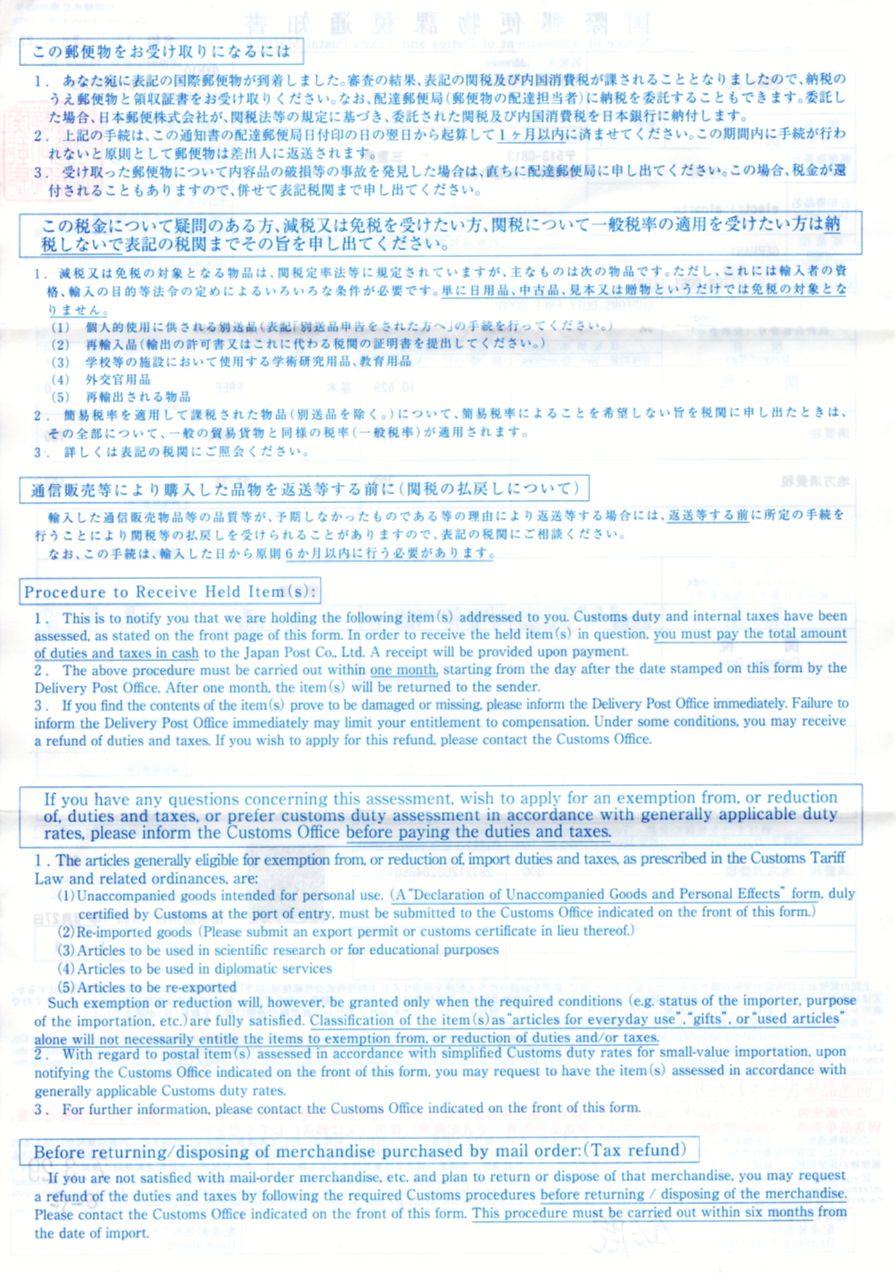 こういうことは過去にもありましたし、eBay USA の商品出品ページにも「当局により、配達時に関税、手数料、税金が適用される場合があります」とありましたので、別に驚きはありませんでしたが、後ほど述べますがひとつだけ不満がありました。
