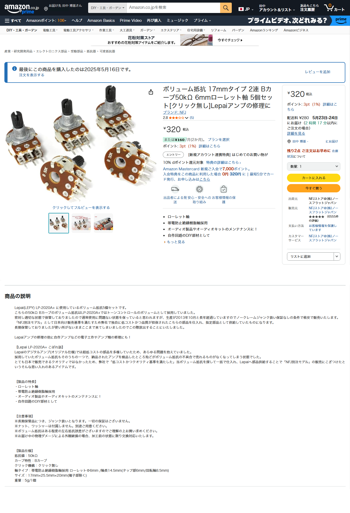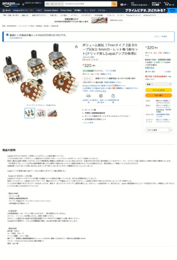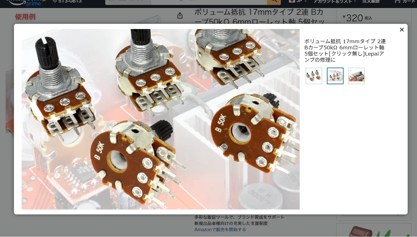 加えてまたこのときに標準品:W.L製 から APAI社製ボリューム抵抗 高品質タイプ B20K x1 B50K x2(右Amazonスクショ) に変更しています。
